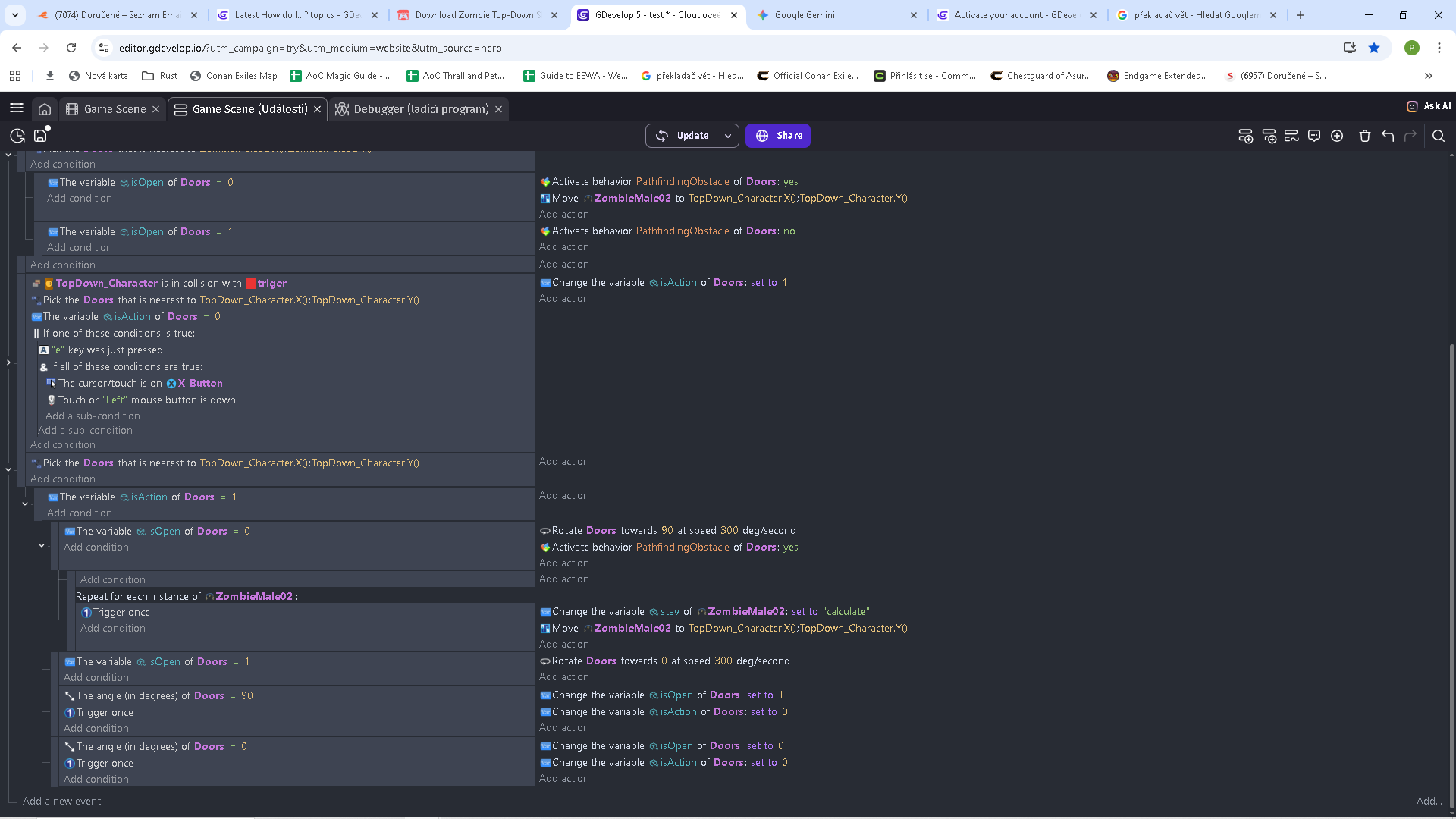 still for the doors, I have variables on them: isOpen(0-close, 1-open) and isAction(0-inactive rotation,1-rotation in progress). The door opening animation is replaced by rotating the object and moving the pivot to the hinge position. Apparently I don’t understand the rotation of the object and its behavior on events correctly, I thought that if I specify in the condition that when I press the button, the rotation will take place by 90 degrees, but that only turned the object by one step, I assume one frame, a cycle of events. That’s why I have those variables on them so that I can handle it.