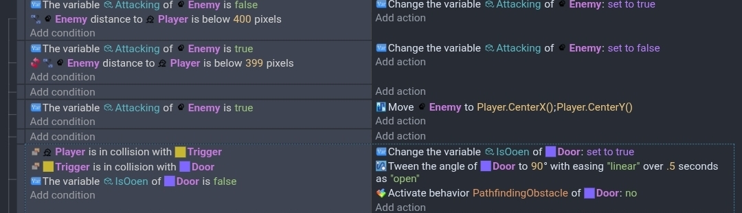 The enemy has a boolean variable named IsAttacking and the pathfinder behavior. The door has a boolean name IsOpen and the tween behavior.