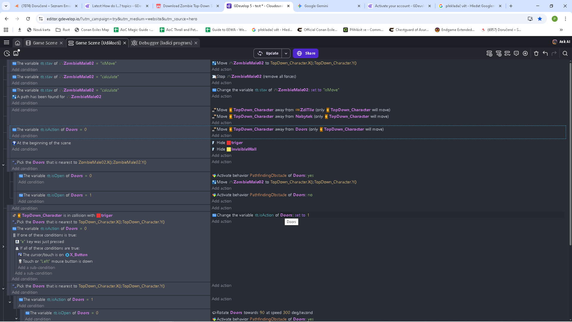 I’m just adding an explanation to the scene: yellow walls (they are just placeholder objects, because otherwise I have walls built from a tileset, the enemy takes these yellow walls as an obstacle) and triggers are hidden in the events at the beginning of the scene. Triggers should only react to the player, so the enemy won’t open them. Yes, I have pathfinding obstacles set on all doors and when they are open, I deactivate them, so it probably shouldn’t matter if they are closed or open. Yes, I’m not sure about my door opening system, I would be grateful for a review and possible adjustment.