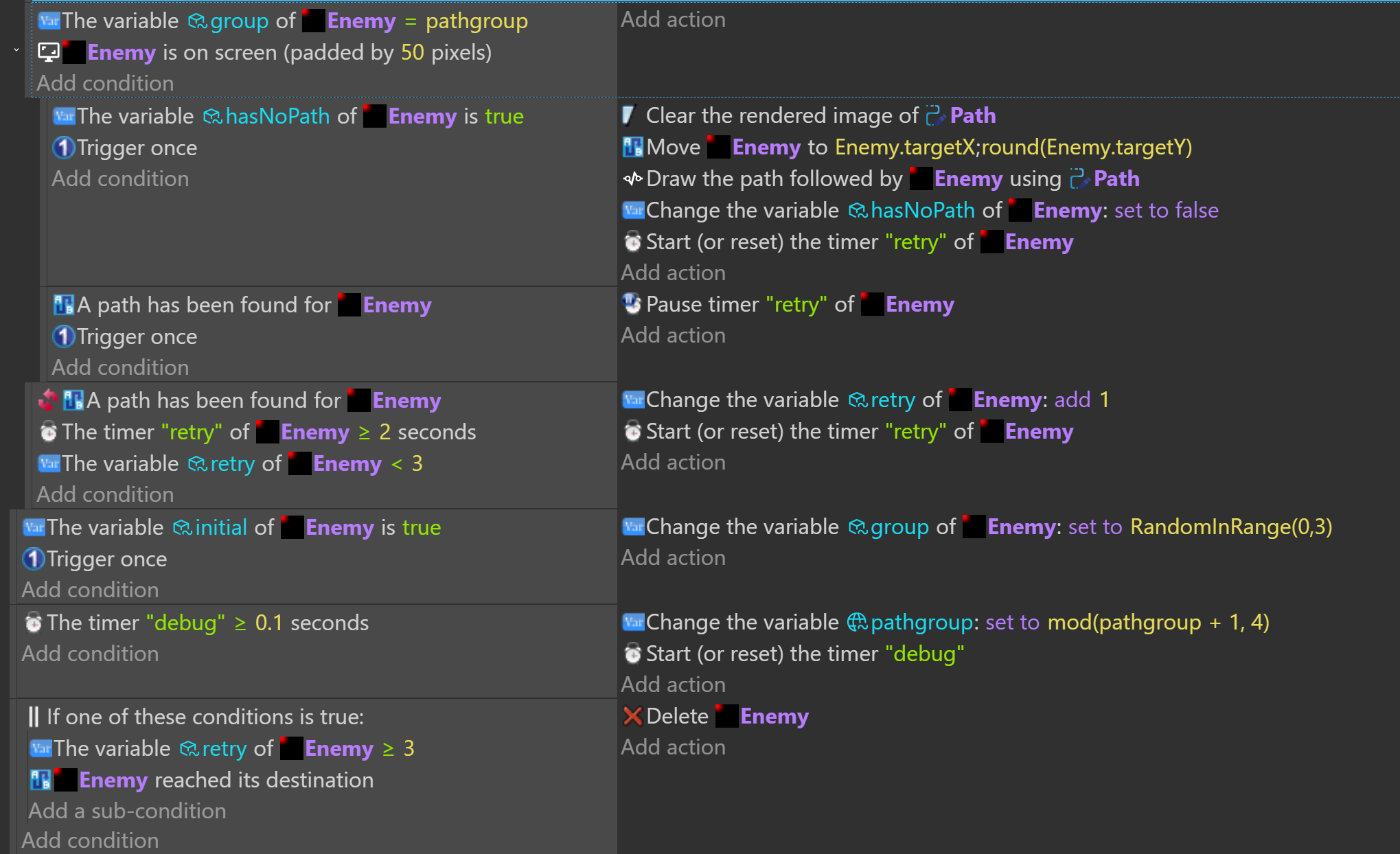 I’m having a problem with pathfinding: even when I set Enemy.Y to make it go straight, it doesn’t go straight—it veers down a little. And what’s worse is that sometimes it just ignores the X coordinate and doesn’t move to the side or the X point I marked. What should I do?