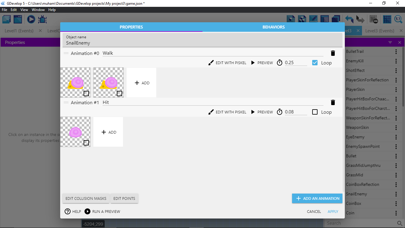 - You need to change the timer to an object timer on the SnailEnemy. Otherwise the timer for all snails is started again once a snail is jumped on or shot at.