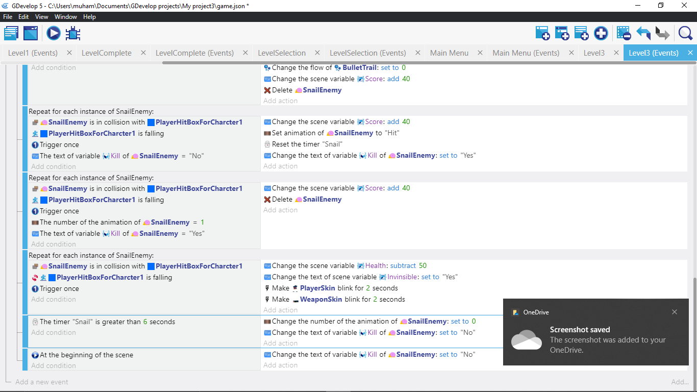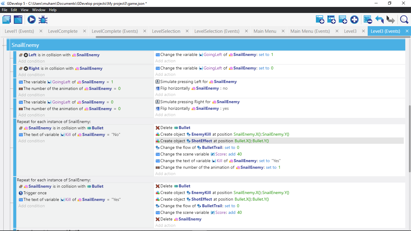 I have make a snail which goes in shell when collide with player falling or collision with bullet. and when it goes to shell it waits six seconds and become normal.But after then collision with bullet and player falling doent work