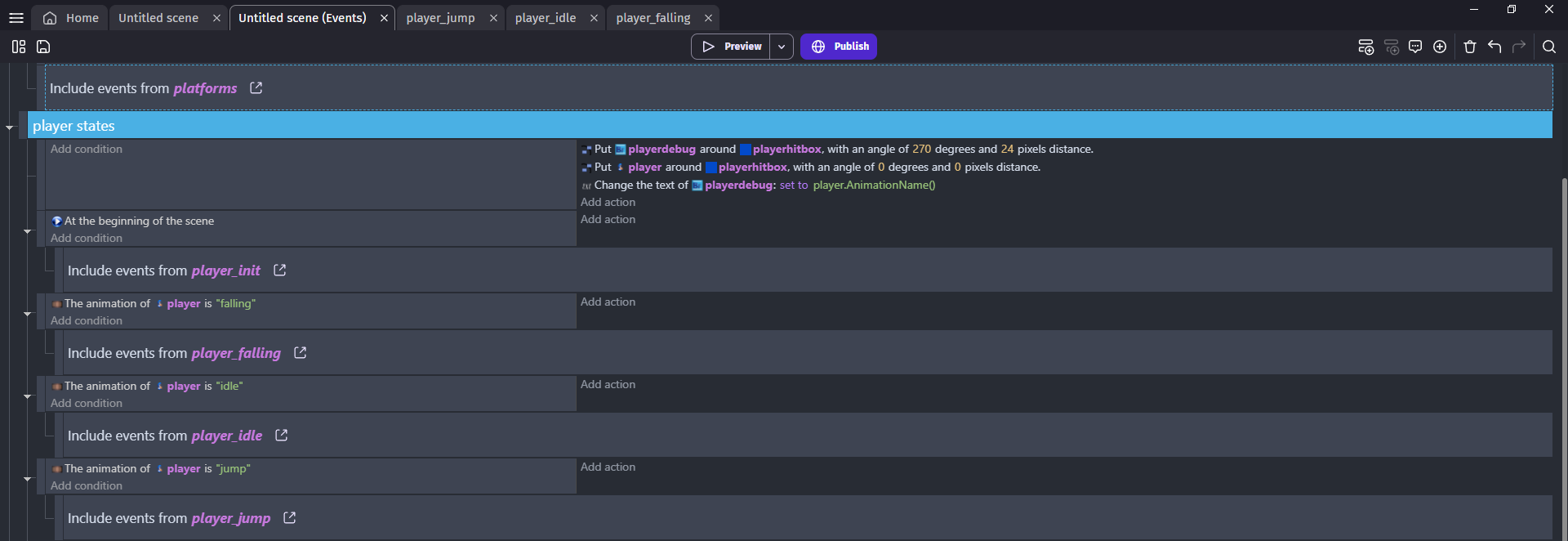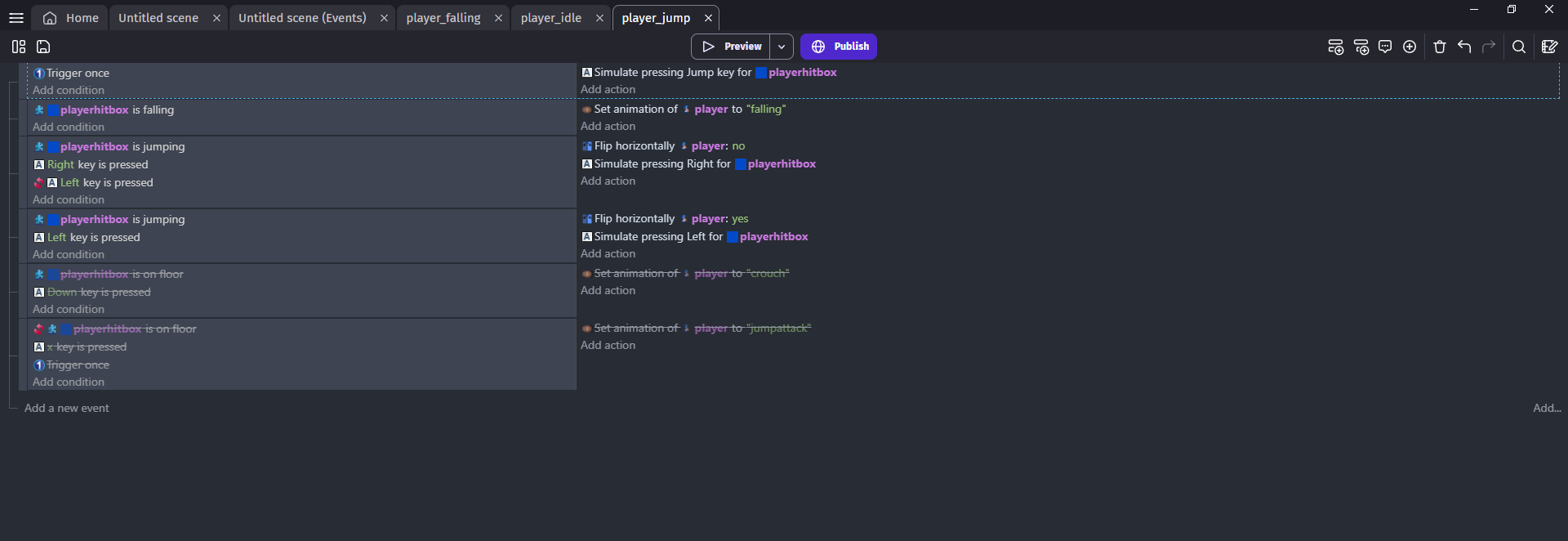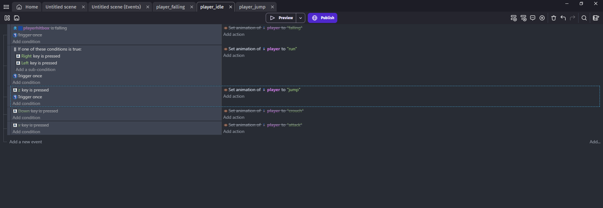 thanks for replying. I did manage to get trigger once working when jumping from idle state but when jumping from run state and key is held the player keeps jumping. in the gdevelop wiki fsm tutorial example pressing the jump key also keeps jumping when held. UPDATE I went back to fsm animation states and moved the jump key press event outside of idle/run states THEN trigger once works for jump