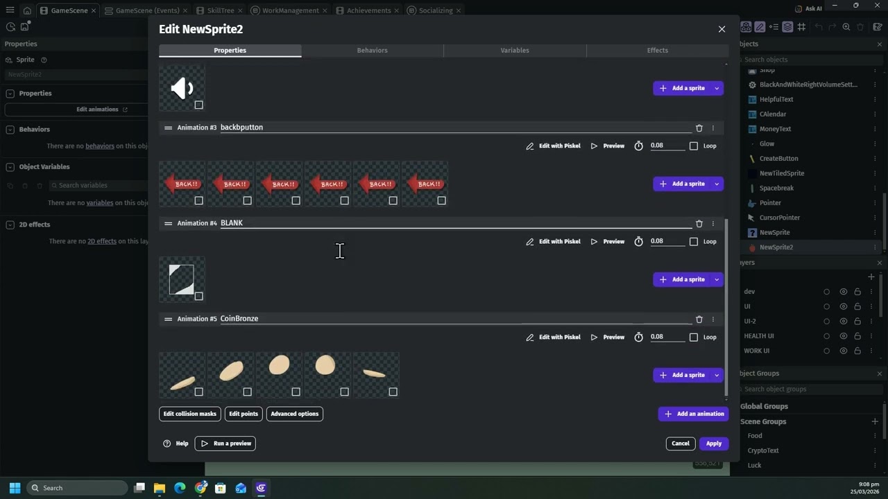 Note: GDevelop would order 10_01 before 01_01 in the sprite object’s animation list. It’s a pain, but you may need to re-order some of the animations if it bothers you that the first anim in the list (anim zero) has your 10_01 sprite instead of your 01_01 sprite. You can drag and drop animations up/down, or use the 2-dot menu to quickly send animations to new positions. Even with this odd quirk, this style of naming should save you a lot of time over importing individual frames one-by-one.