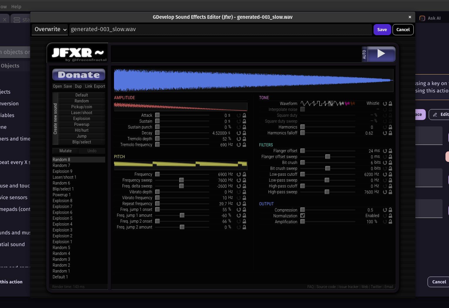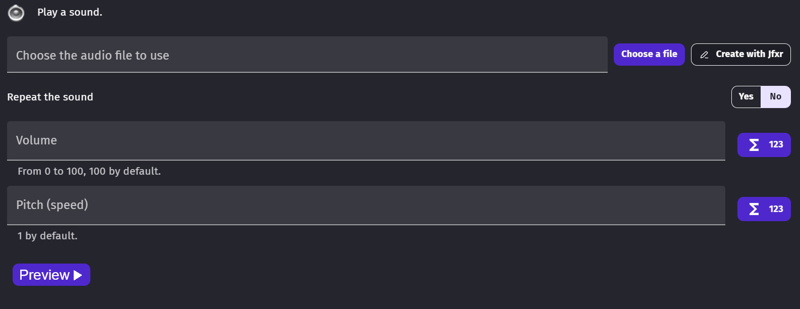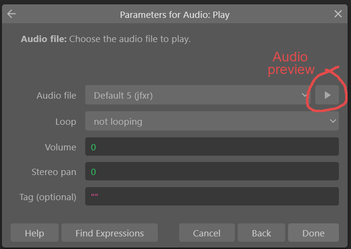I did try to use jfxr since there is a “edit with jfxr” button that appears when you import an audio file to see if it can work for preview. But as far as I’m aware this app only displays sounds saved within Jfxr itself. And the “open” button within the app doesn’t work either. At least it didn’t work with .wav files, but I suppose it’s only for .jfxr files made with the application as well.