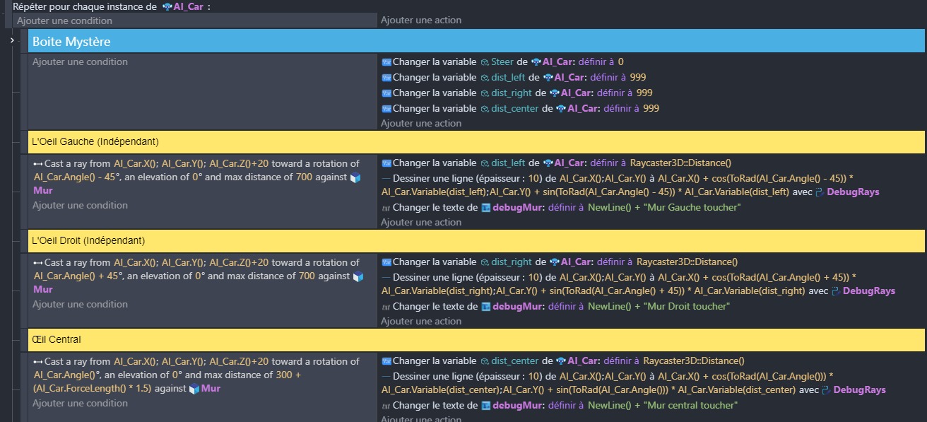 Ma question : Comment puis-je modifier mon système pour que les Raycasts détectent aussi les autres instances de AI_Car ? Dois-je utiliser un Groupe d’objets (ex: Groupe “Obstacles” contenant Murs + Voitures) pour mes Raycasts, ou existe-t-il une meilleure méthode en 3D pour que les instances d’un même objet s’évitent entre elles ?