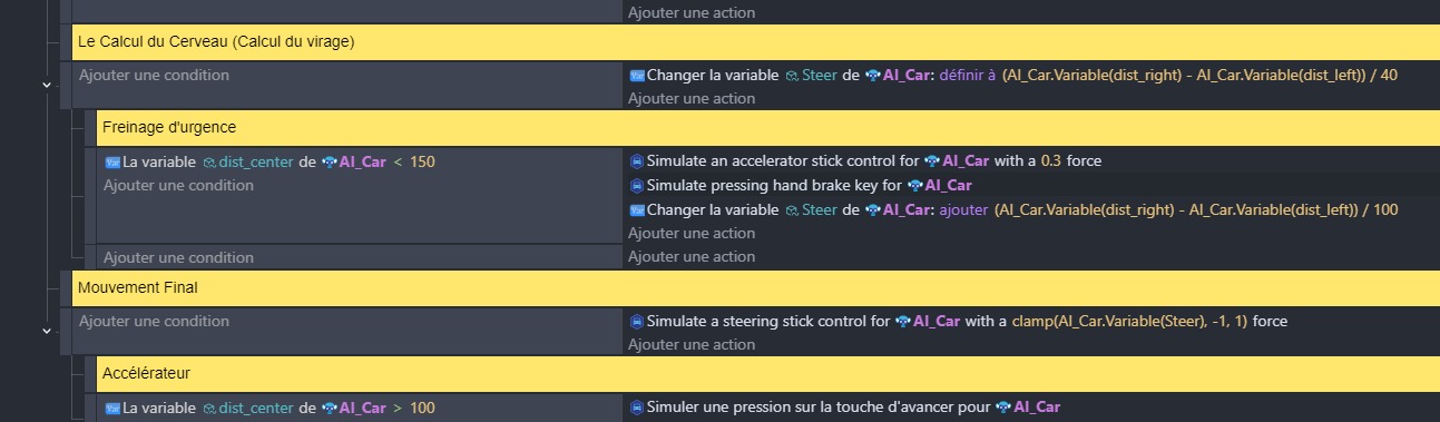 Je travaille sur un projet de course en 3D et je rencontre un problème avec mes IA. J’ai créé un système de “cerveau” basé sur trois Raycasts (Gauche, Droite, Centre) qui détectent les murs pour permettre à la voiture de s’orienter et de freiner.
