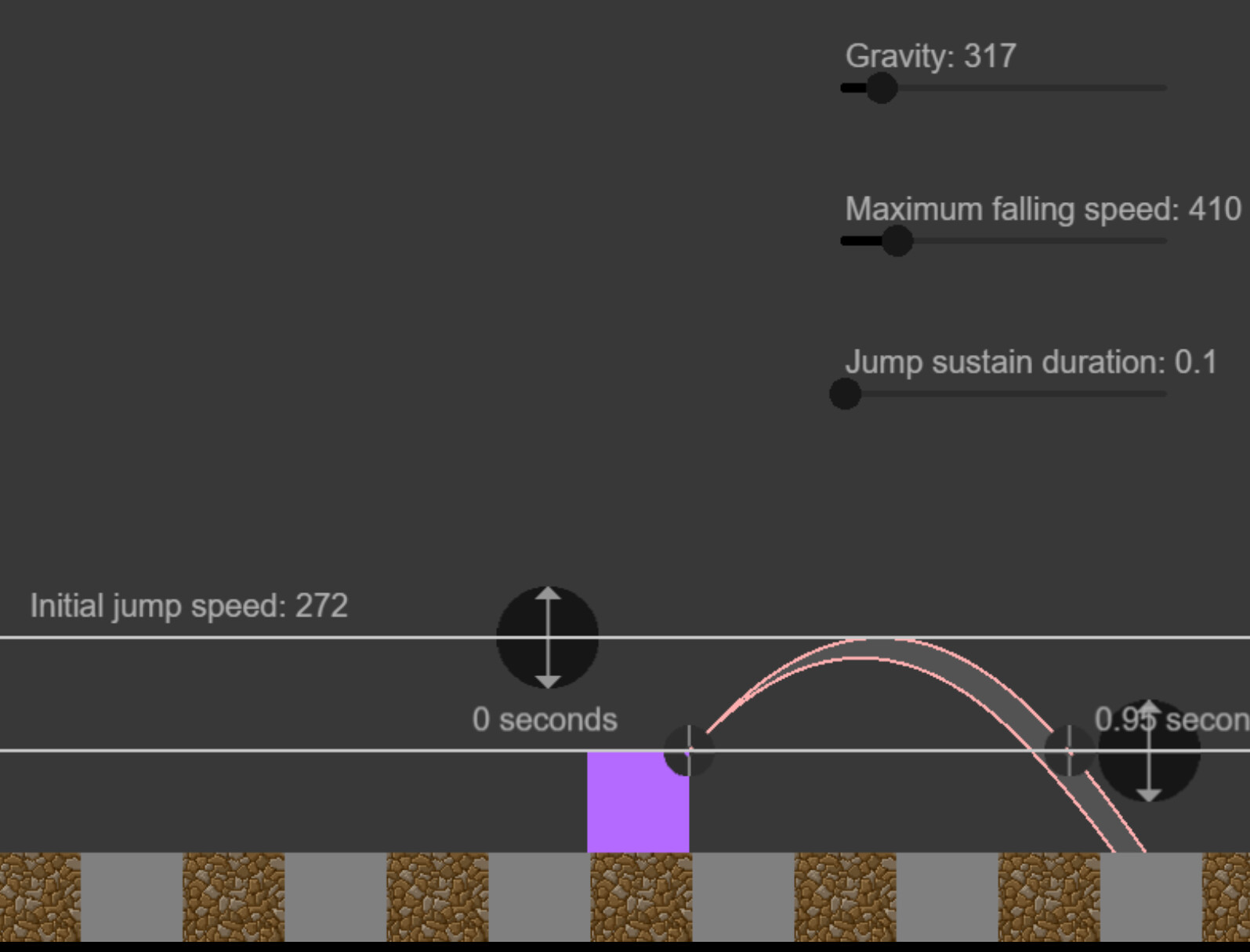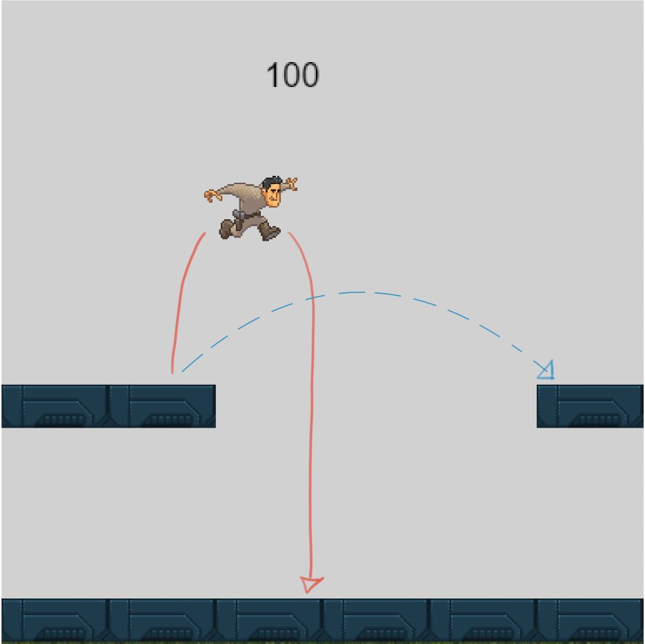 Lo que hace el personaje (Baal en los listados). El 100 que ven es porque la velocidad máxima es esa cuando está en el suelo; trato de alterarla a 300 para los saltos, y restituirla luego, pero no hay caso. Se mantiene siempre en 100. En el caso en que la pongo a 300 fijo, la aplica DESPUÉS del primer salto; nunca inicialmente. En rojo, el salto actual, en celeste, lo que quisiera lograr.