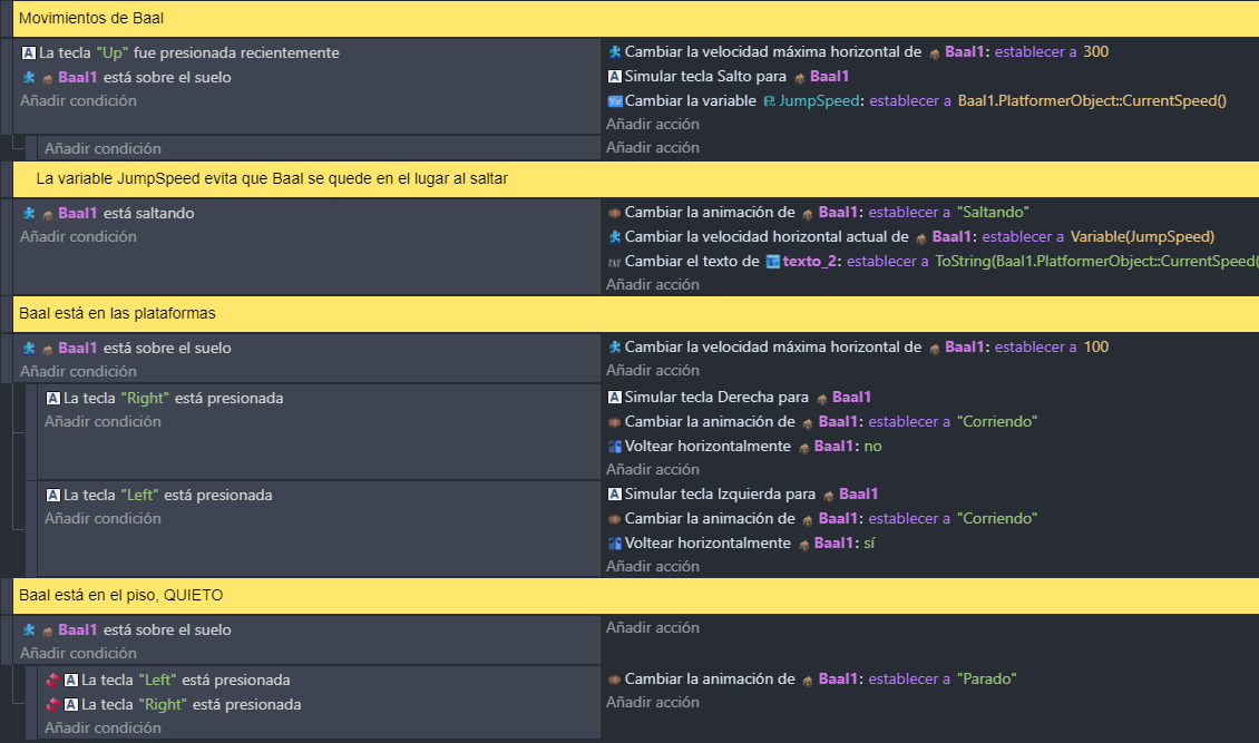 Hola gente. Aclaroque soy RECONTRA novato. Juego estilo el viejo Prince of Persia del 89. Estoy tratando de hacer que un personaje corra a cierta velocidad y pegue un salto largo y bajo, estilo Prince of Persia, y si, sin que sea controlable ya en el aire; o sea, lo opuesto a la rutina predefinida de GDevelop. Me estaba ayudando la IA de Grok pero no logramos solucionarlo. Subo las imágenes para el que tenga tiempo y ganas de responderme, que para la mayorĂa debe ser una tonterĂa, pero para mĂ es un mundo infranqueable.