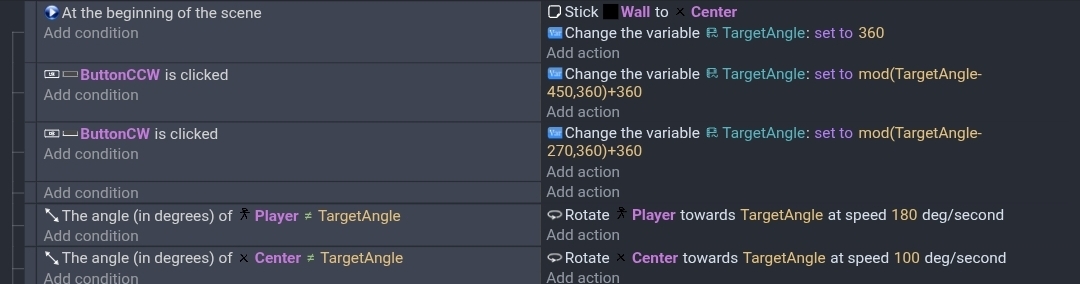 - Nothing in the OP’s event sheet has them rotating towards a common center, as none of the events deal with their center. They’re just rotating to a specific rotation angle, but rotation is based off the center point of each object so if either of them have a modified center point, their rotation angle is going to look VERY different.