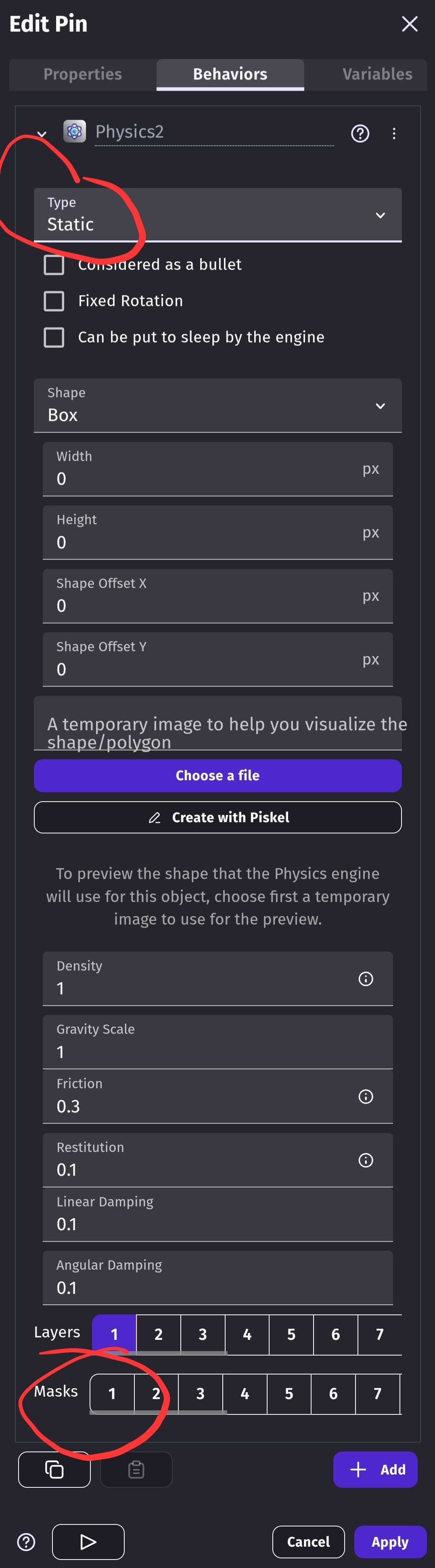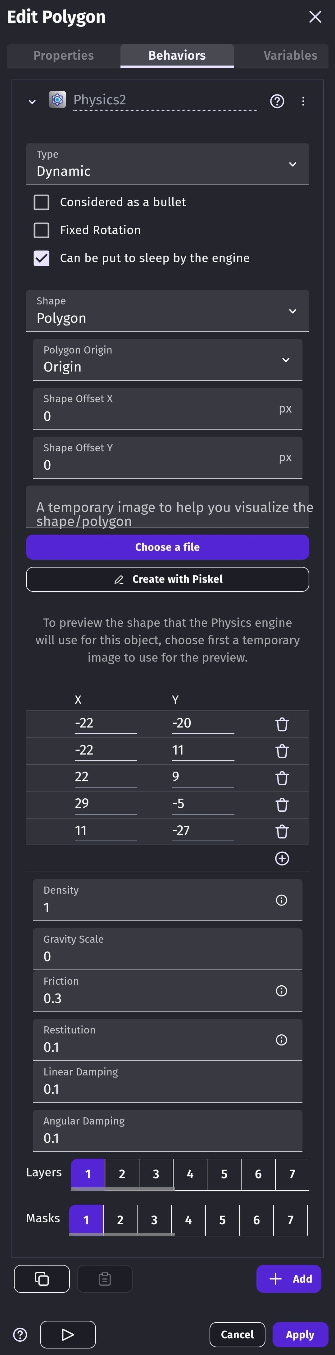 Hi Keith. It’s a static physics 2 object. I was using equilateral triangles but because the center of the triangle wasn’t the center of the sprite the collision shape was shifting as it turned. It seems that center is referring to the sprites center and has nothing to do with the objects points …which wasn’t obvious. There’s the phrase…,‘uses a separate collision to the object collision mask’ but there also needs to be …‘center refers to the sprites center’ as I was trying to use the y offset and all sorts. I’m rotating by hard rotating and adding to the angle.