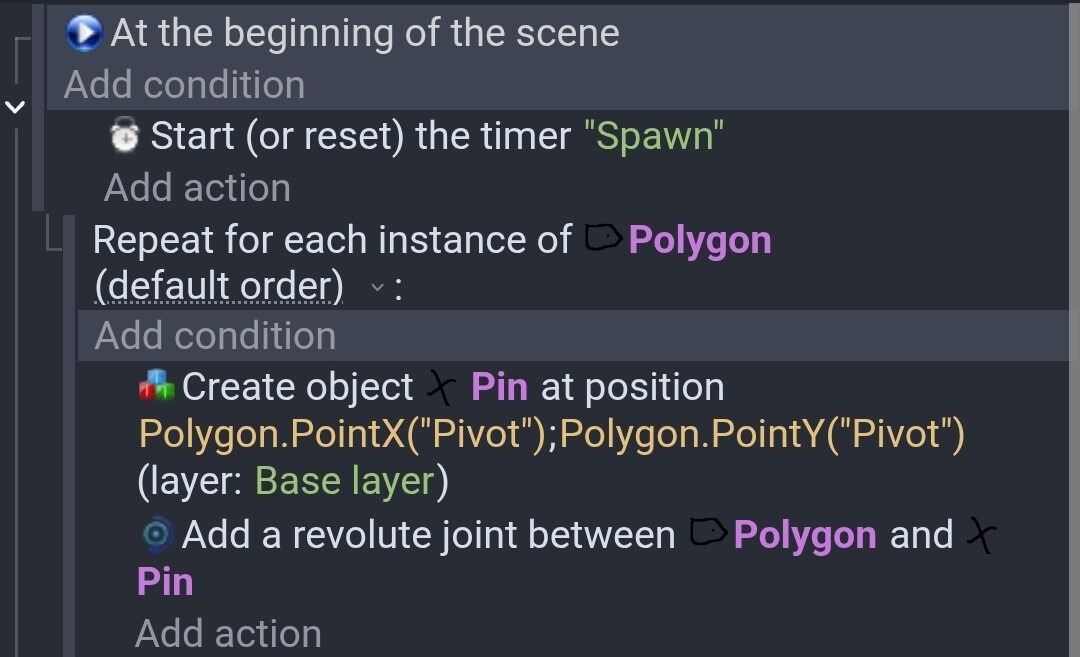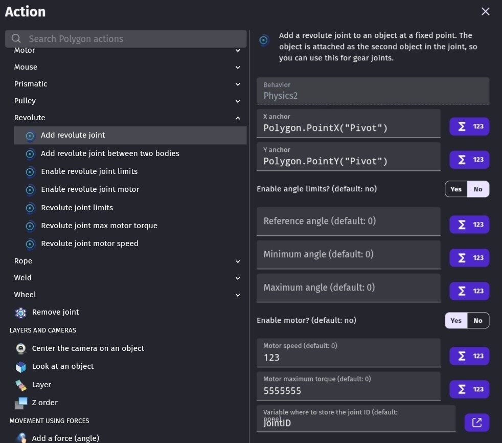 All you need is the add joint event. It has an option to use a motor. You click yes and set it’s speed. If you want to modify or dele the joint later, you can save the joint ID to a variable but it has to be a scene variable. When using multiple objects, you can copy the scene variable to an object variable.