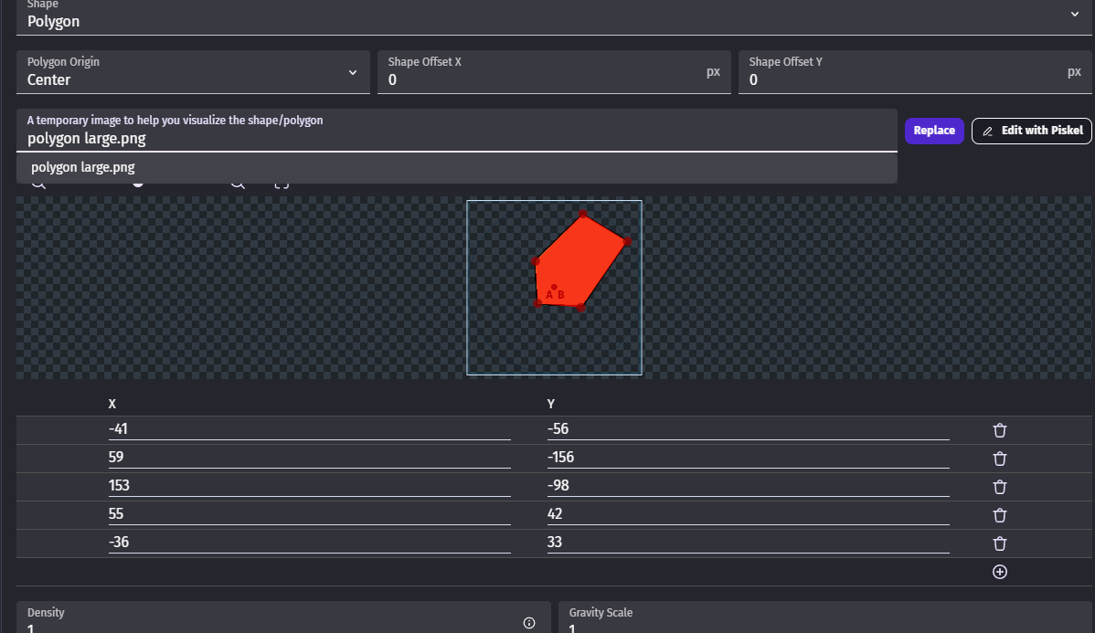 Hello - I recently struggled to create the physics2 collision for a rotating polygon with centre and origin that wasn’t the middle of the sprite. It took me quite a while to work out what was happening. Basically it seems that the solution is to expand the sprite size to make the centre of the sprite the same point as the centre of rotation - see pics