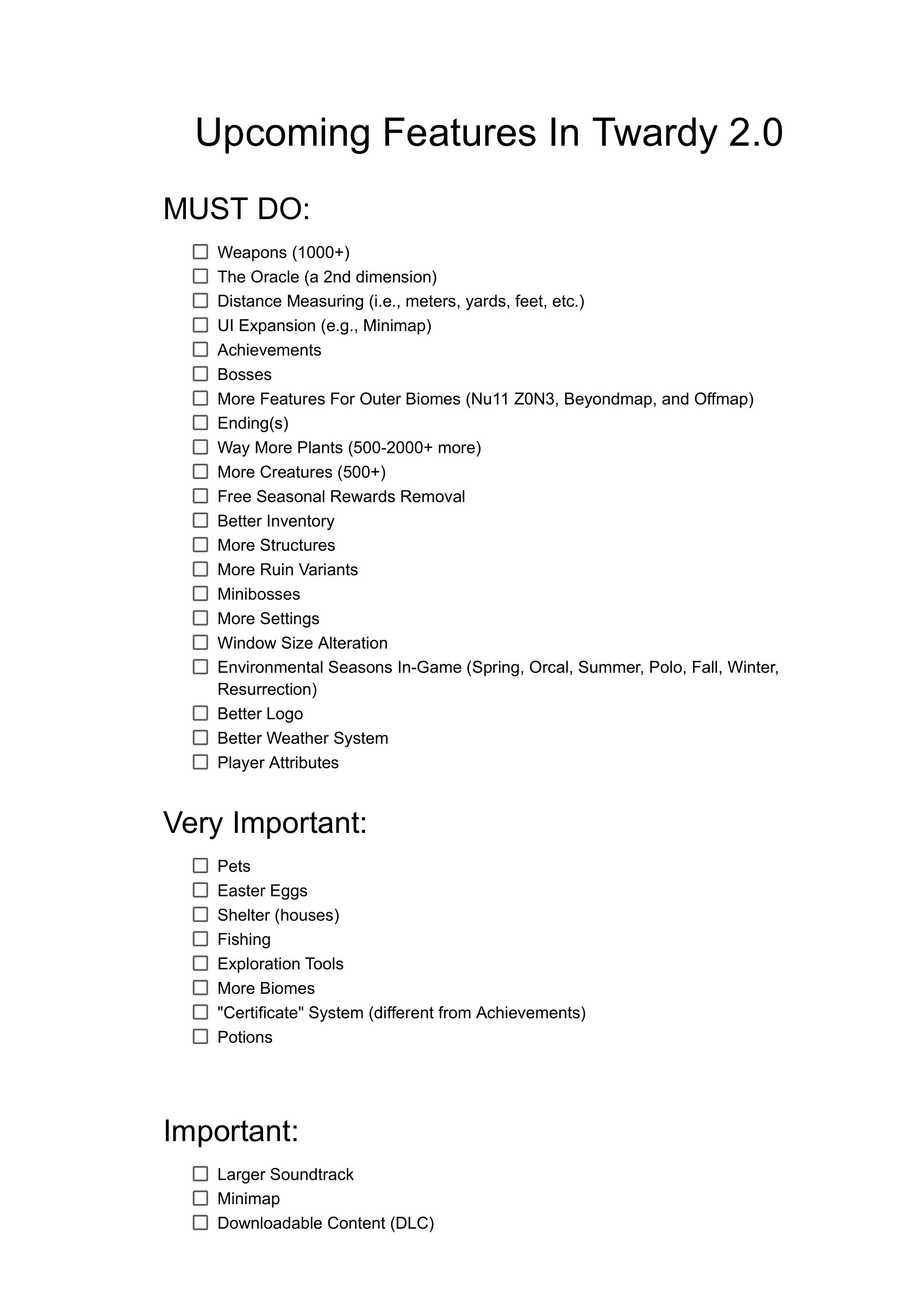 Every time I want to work on Twardy 2.0, I just don’t really feel like it. Honestly, the only features I want to add now is the 2nd dimension.