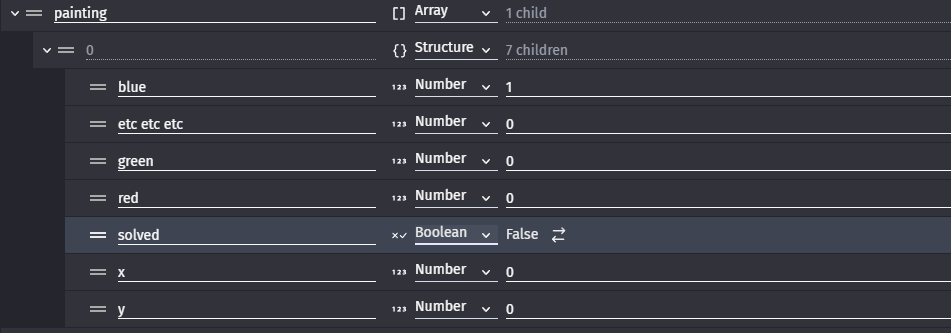 m going to complicate things again. The R;G;B elements of each painting could be stored like this usersaves.painting[painting.id].red =255