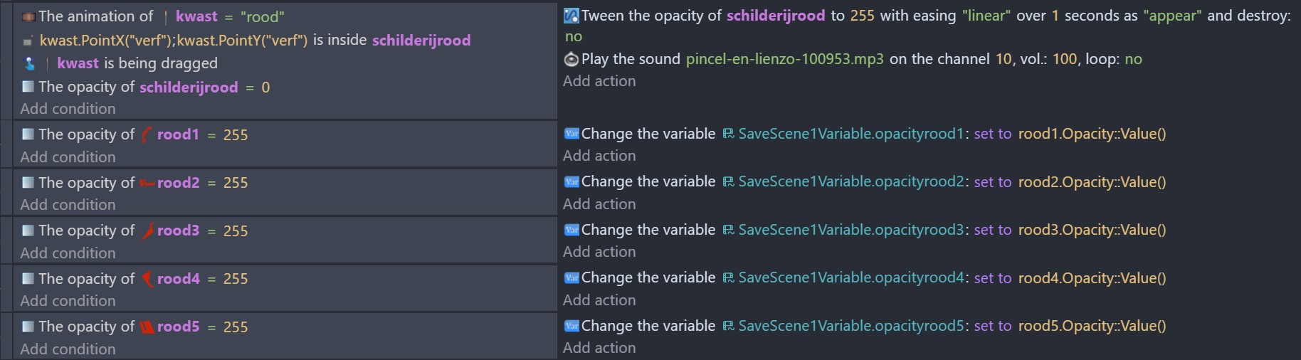 Hi Jastrid - i noticed that in the events you’ve got …condition; number of animation of color1 less than 4 and then below it as a sub event you’ve got condition - number of animation of color1 equals 4. - these can’t go together. they need to be separate conditions. (Edit - if there is no animation 4 i think it’ll return 0 and so the sub event is processed)