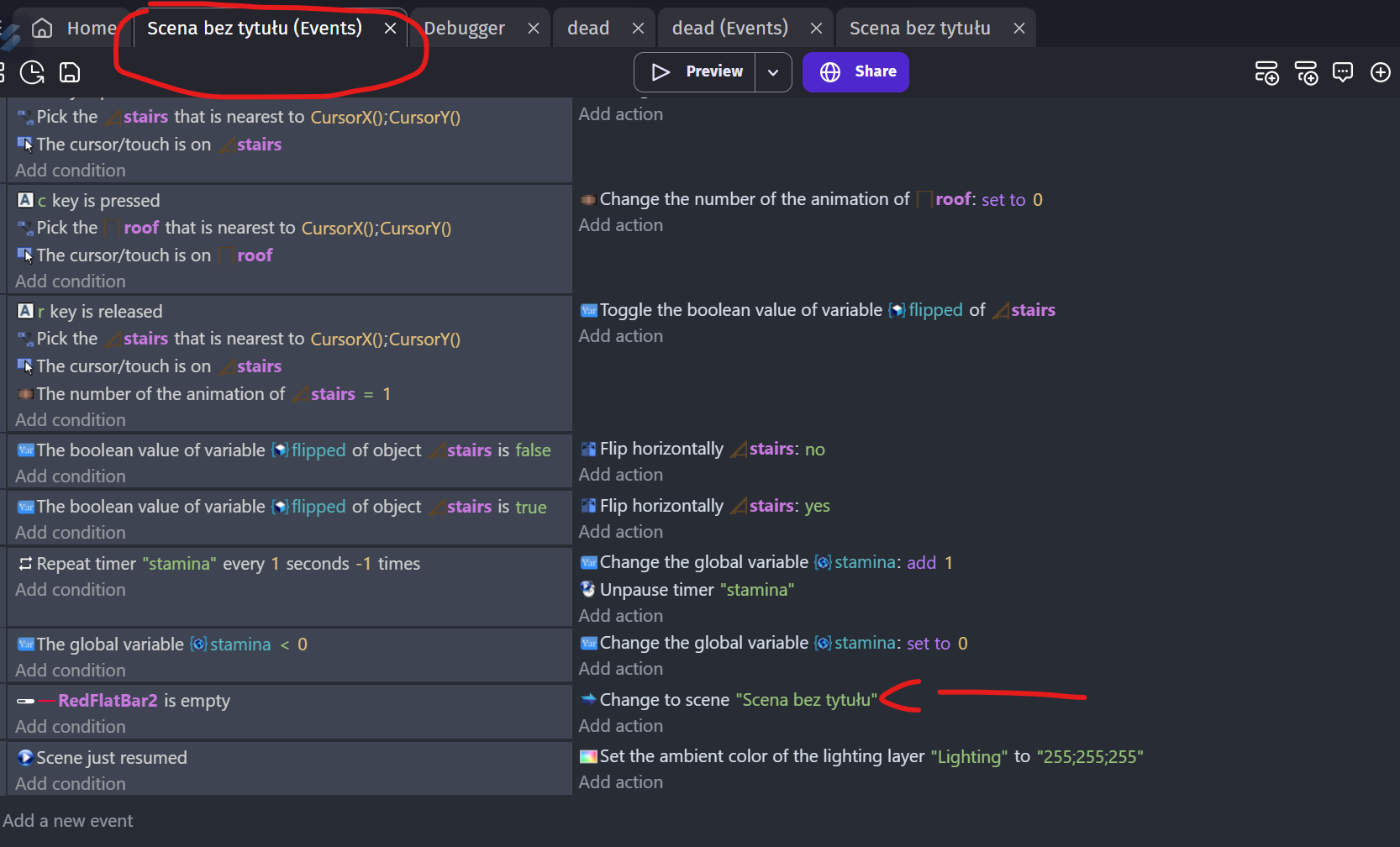 That can’t be all of the events. Can you include screen shots of the events that are kicked off at the beginning of the scene? And are you using any global variables to set up the scene?