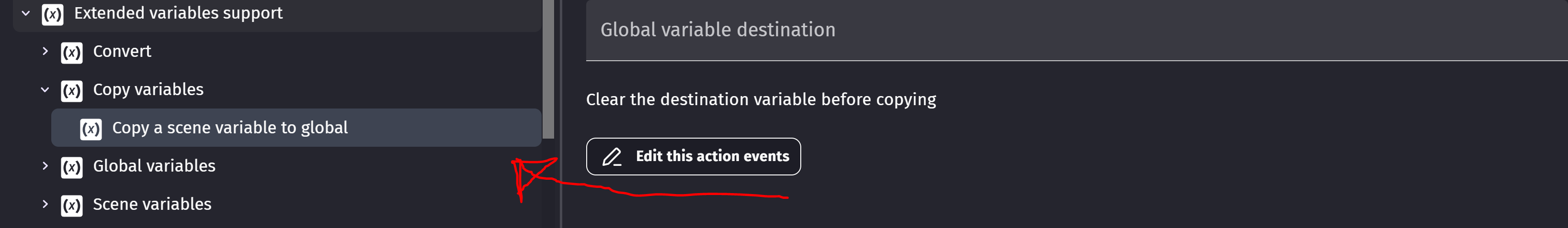 Separately from that, you can also just copy a scene variable to a global variable by using the “Convert JSON to variable” action and just do ToJSON(YourSceneVariableHere) as the json, then The global variable as a variable.