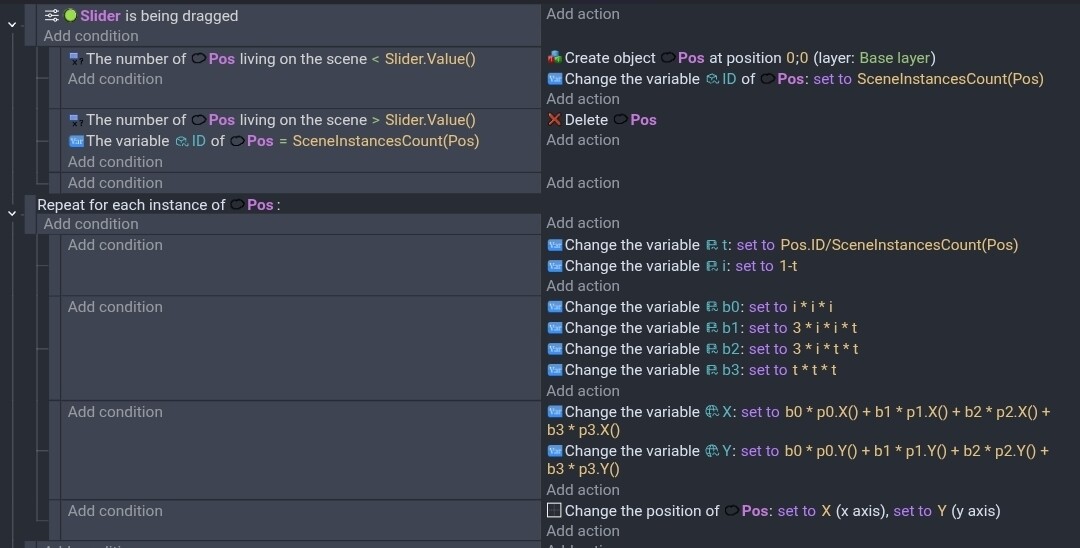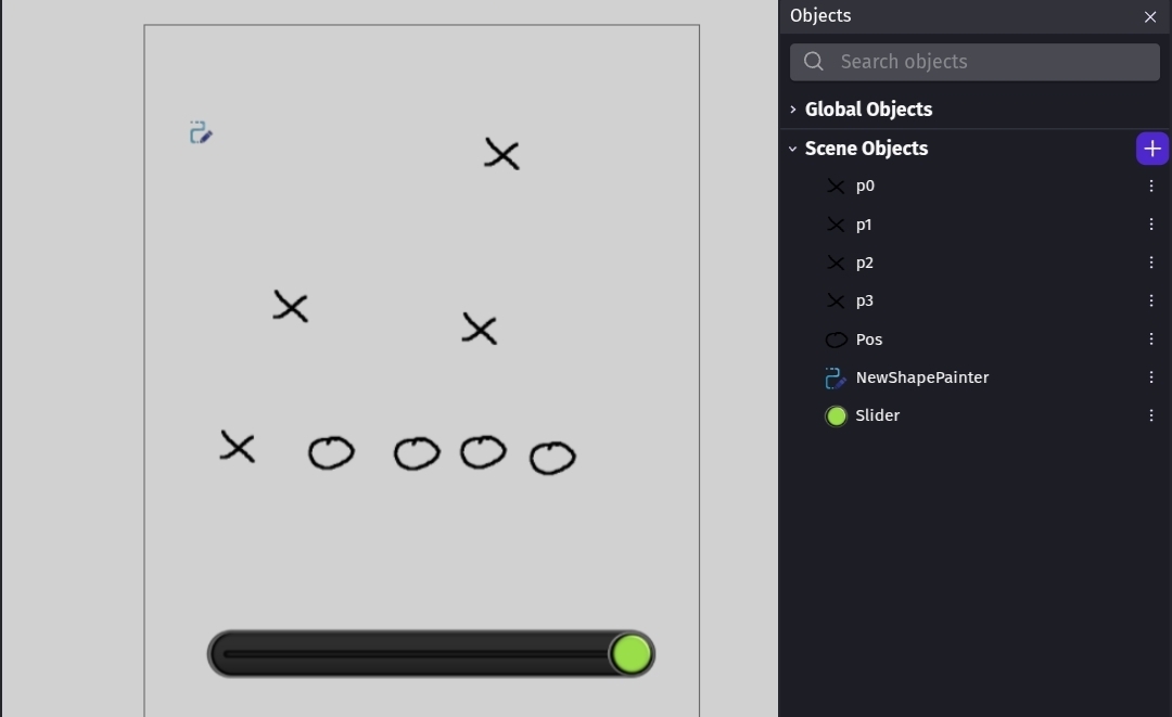 My method uses 6 objects. p0 is the start, p1 is the 1st control point, p2 is the 2nd control point and p3 is the end point. I added the drag behavior for testing. They’re the X objects.