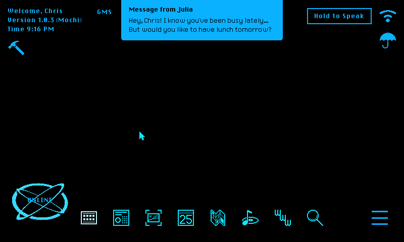 This operating system is actually codenamed AndromedaOS, because the device is named GMS. GMS was much like a tablet, except it clipped onto your arm in a housing. Many people referred to it as a “Pip-Boy” in its form factor. The device was designed to be as premium, but as cheap as possible to make it affordable to everybody, which was done through intentionality. It was a device meant to enable communication, and to help manage certain parts of your life. Its planned app store had tight restrictions against most types of social platforms, as the device was designed to better you, your physical health, and your mental health. The obvious exception for this was gChat, the platform’s chatting app.