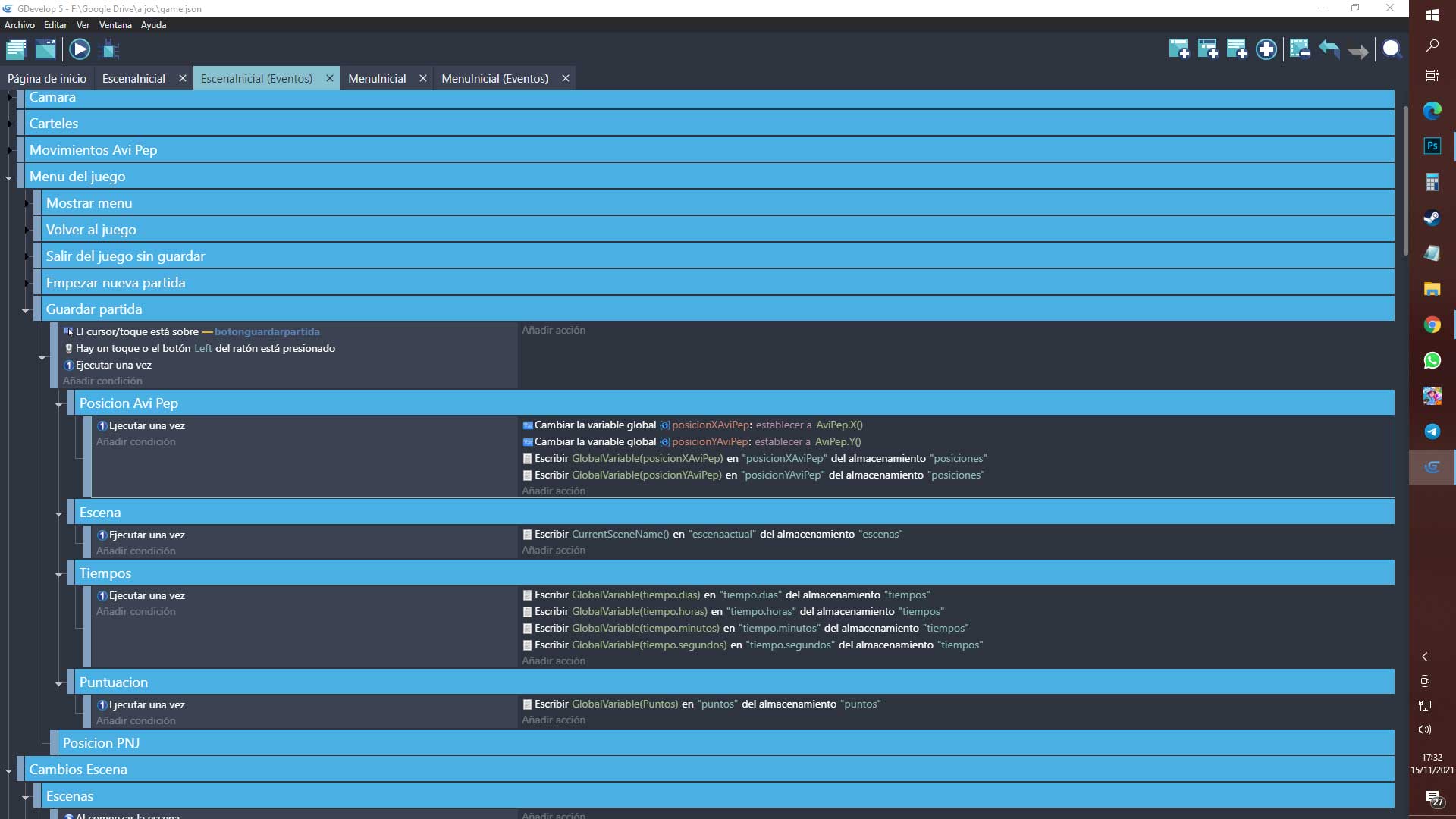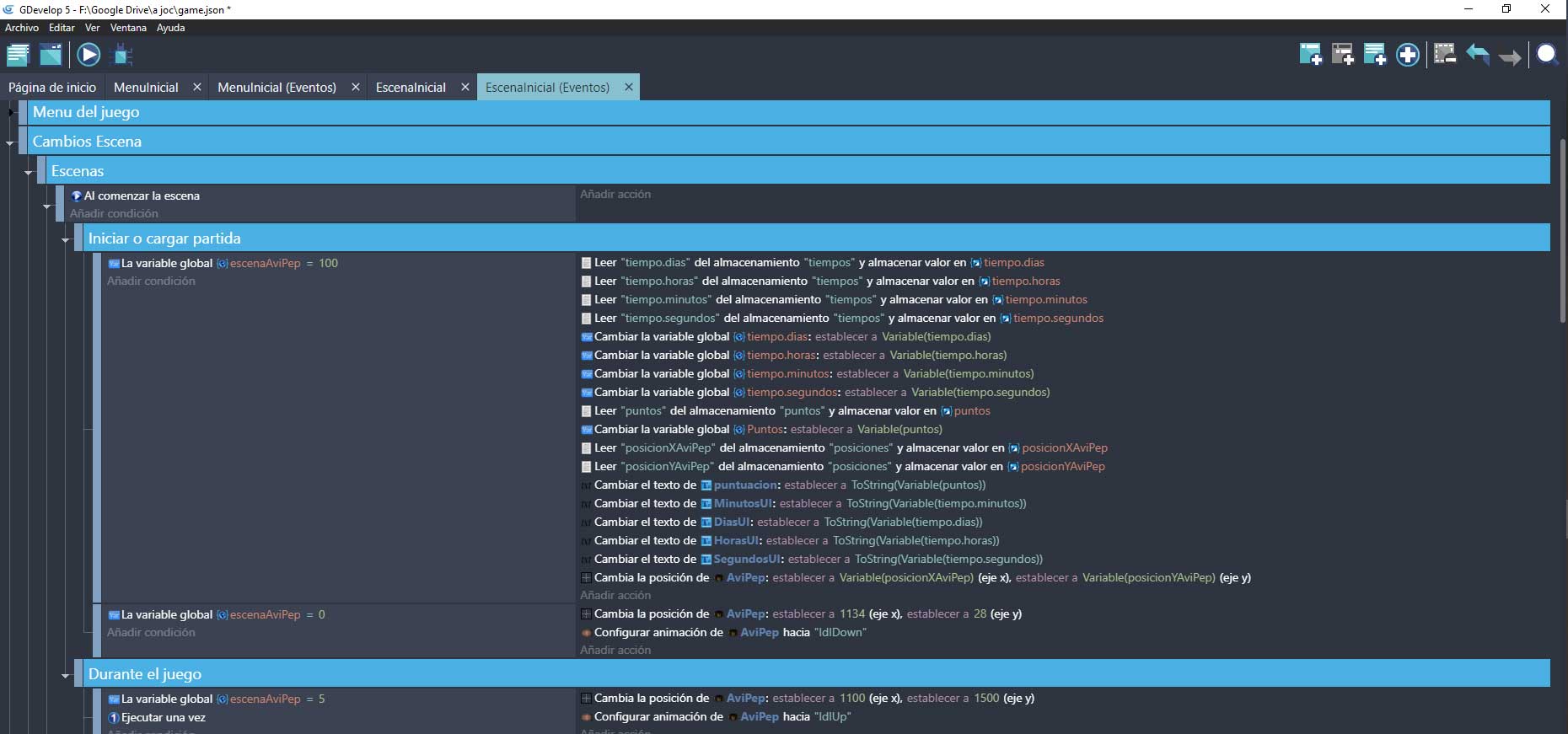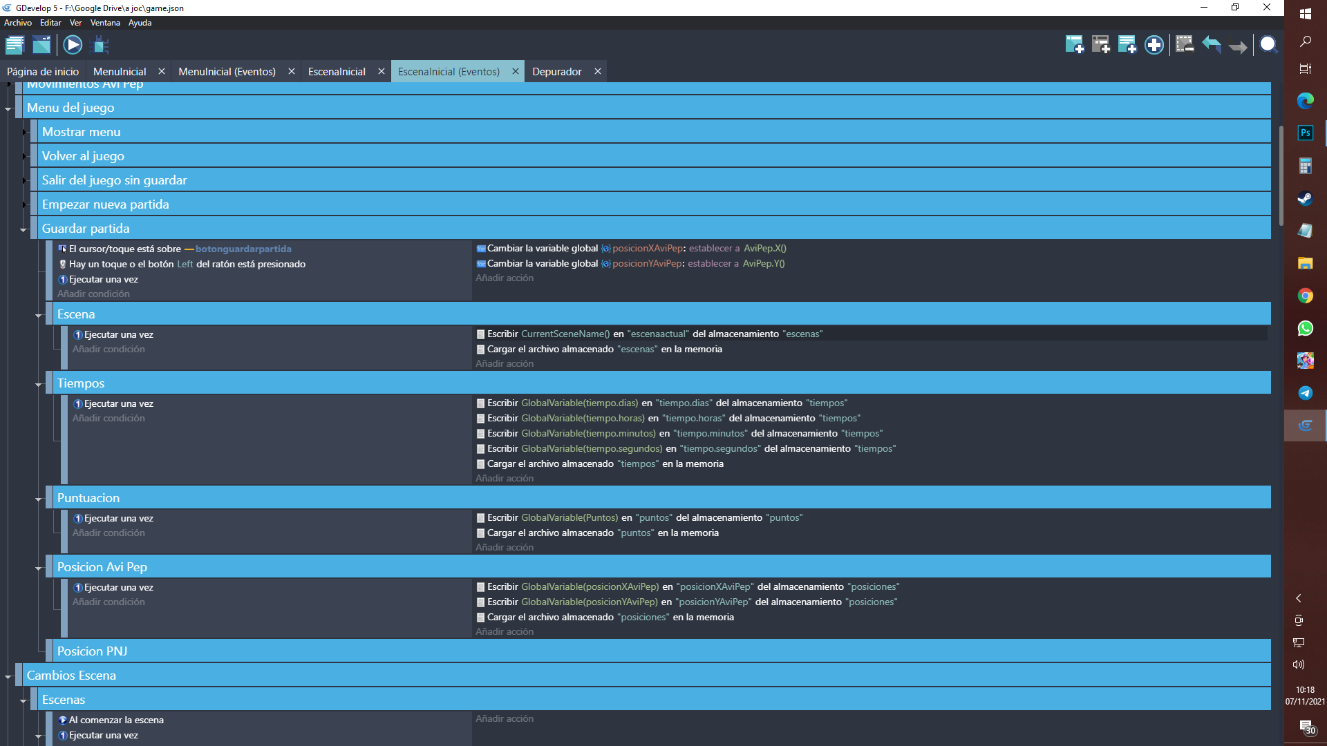 Hola Ulises, he hecho algunos cambios en los eventos, sigue sin funcionar bien, en la vista de consola se ve que ha guardado la escena y los puntos pero no ha guardado las posiciones del AviPep (player) ni tampoco las variables de tiempo.