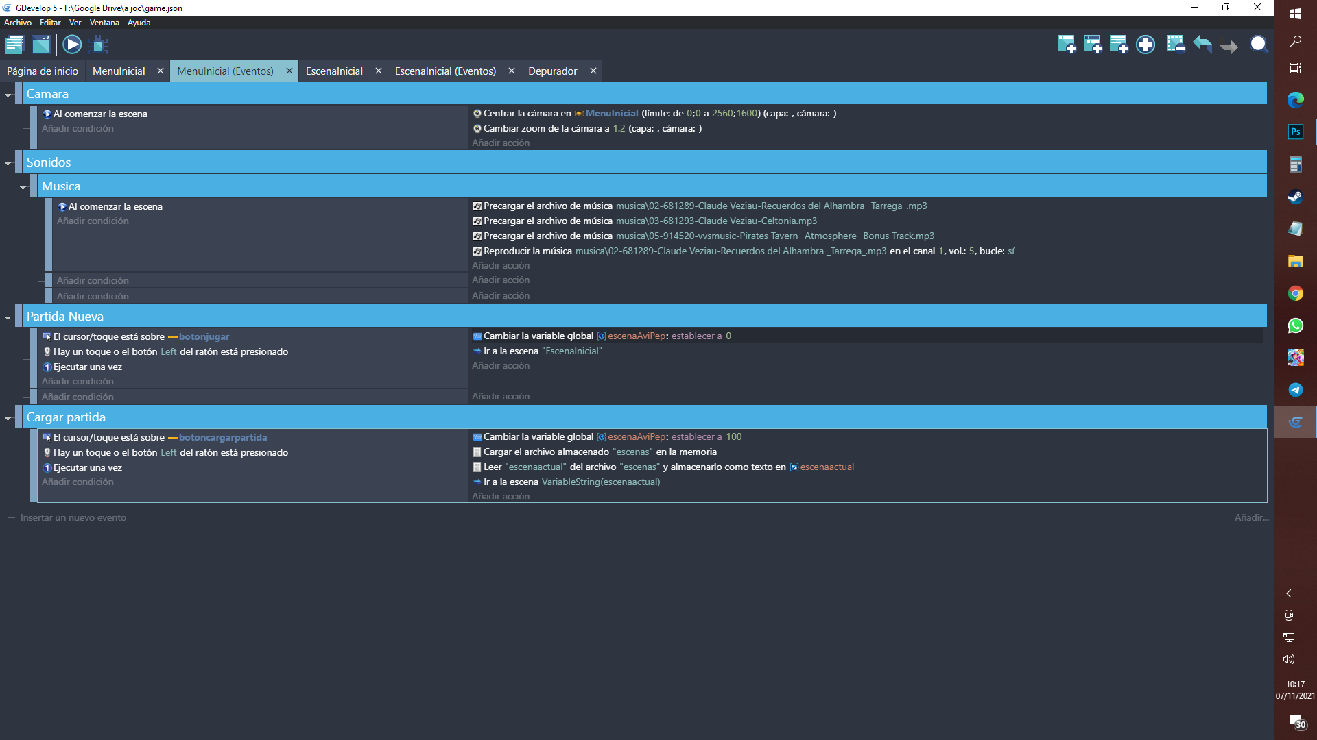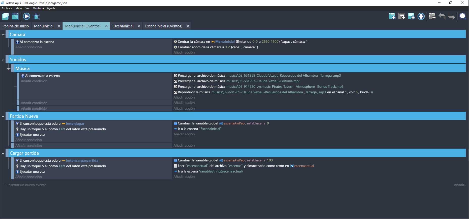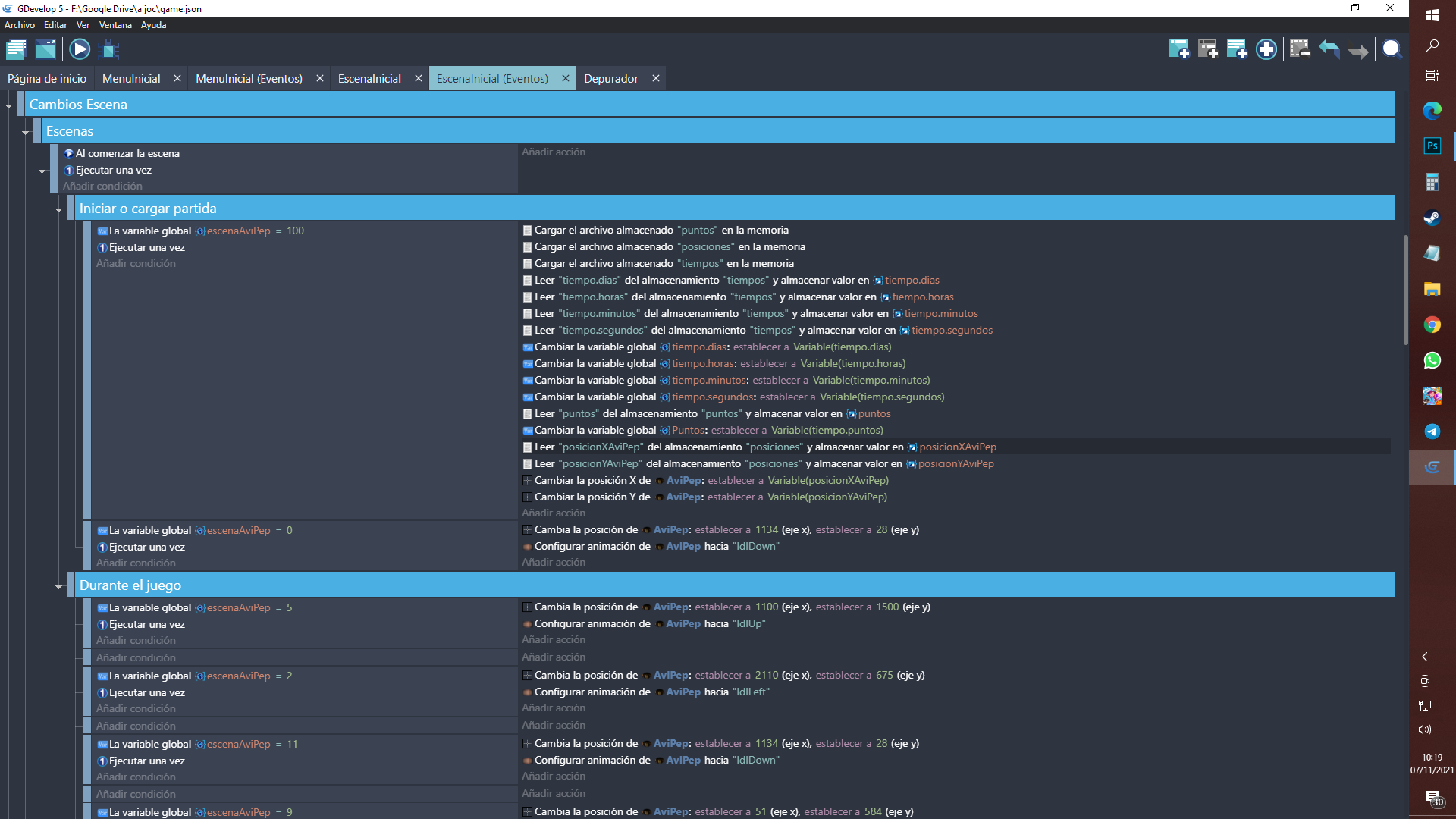 Hola Ulises, he hecho algunos cambios en los eventos, sigue sin funcionar bien, en la vista de consola se ve que ha guardado la escena y los puntos pero no ha guardado las posiciones del AviPep (player) ni tampoco las variables de tiempo.