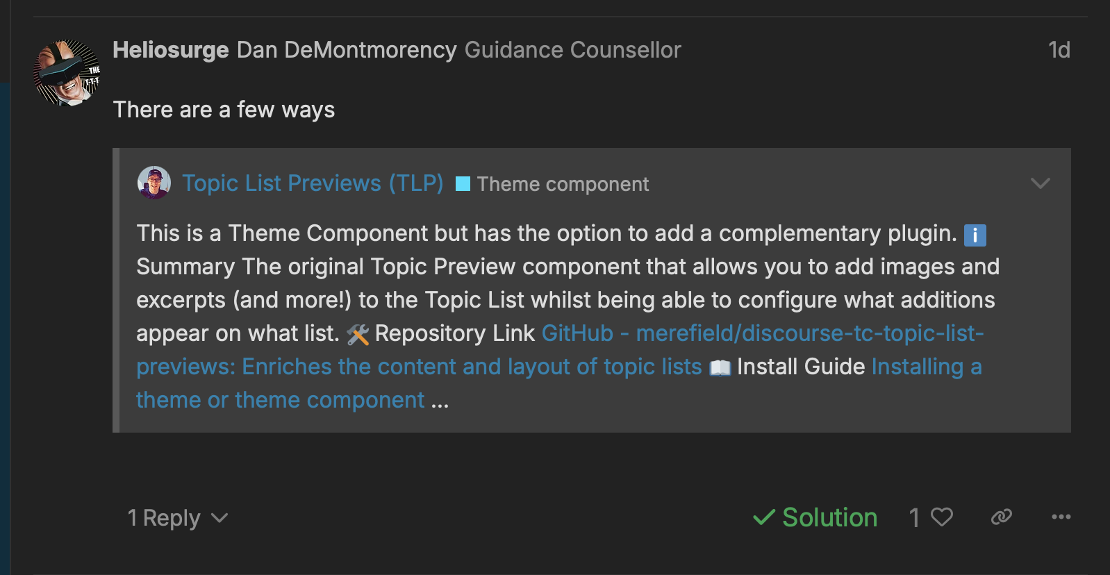 The solution plugin is a plugin that allows topic owners to mark a reply as the "Solution" as shown in this photo:The green checkmark shows that this reply was marked as the solution. Also, at the very top of the original post, it looks like this: