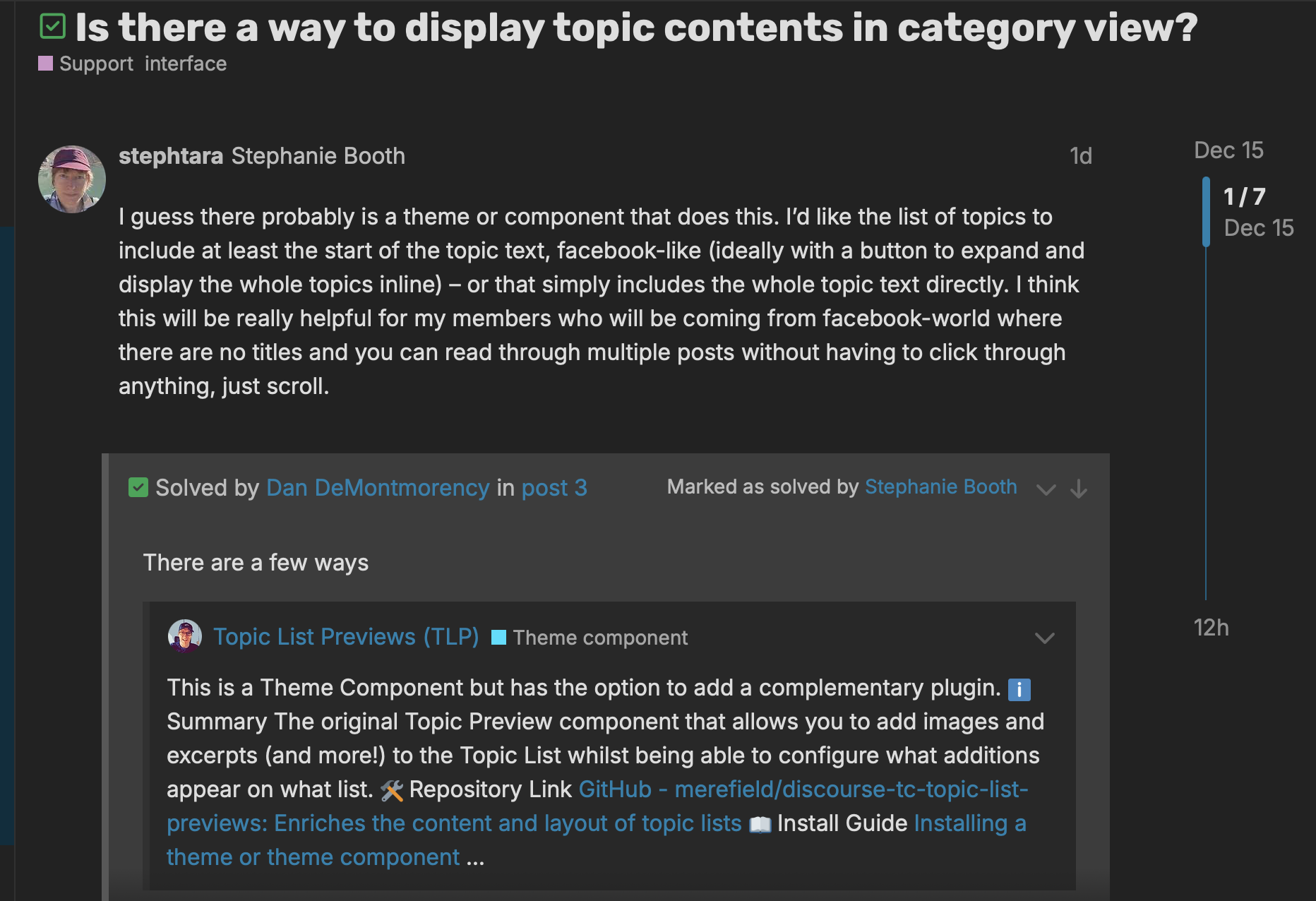 Green checkmark next to the title, with a box that says “Solved By [username]” with their exact reply that fixed the issue.