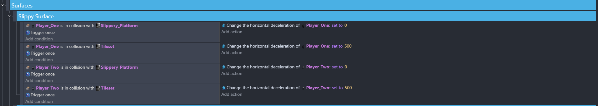 I have slippery ice platforms that make the player slip (making my Player have a deceleration of 0) Before an update this was working, but now my player just falls through the floor, there are no events that disable the platform for my object: which is a tileset by the way. And I haven’t changed any events, just building the levels. My levels are external layout also. And what is even weirder that for all levels without a slippery ice platform, my player doesn’t fall through, just the levels with a slippery ice platform. Here are my events for the slippery ice platform just in case: