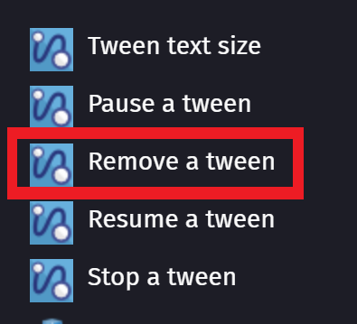 It’s labelled “Remove a tween”. Click on Add action in the event, click YouXNA (since it’s being removed from the object) and you should have these options at the top of the actions list: