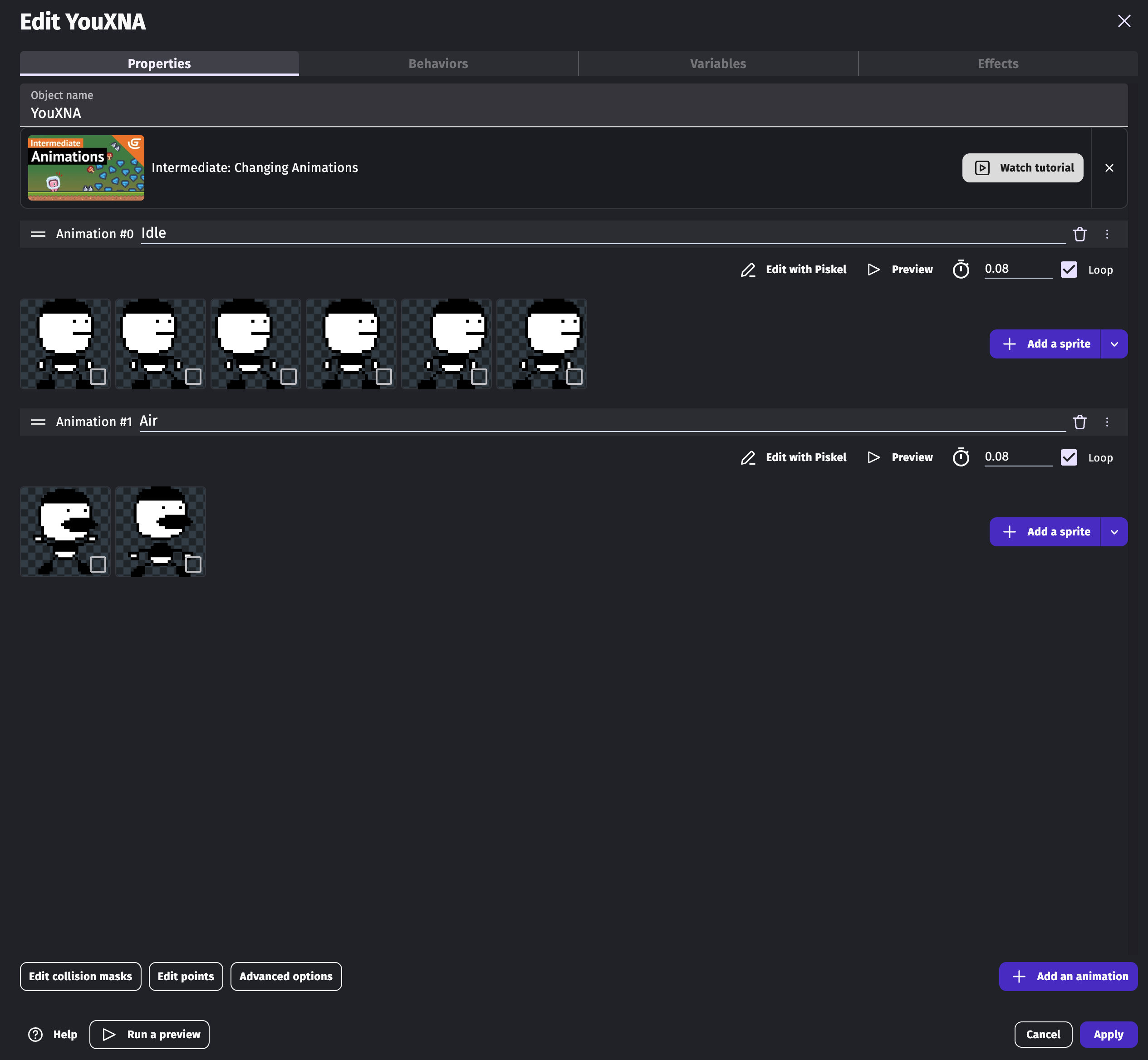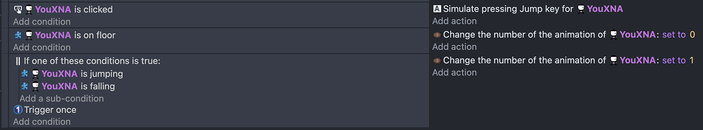 I’m trying to make a minigame where the animation 1 plays while airborne, so I put an OR block that checks for jumping or falling, but without the trigger once it gets stuck in the first frame and without it it plays for 1 frame and goes back to animation 0.