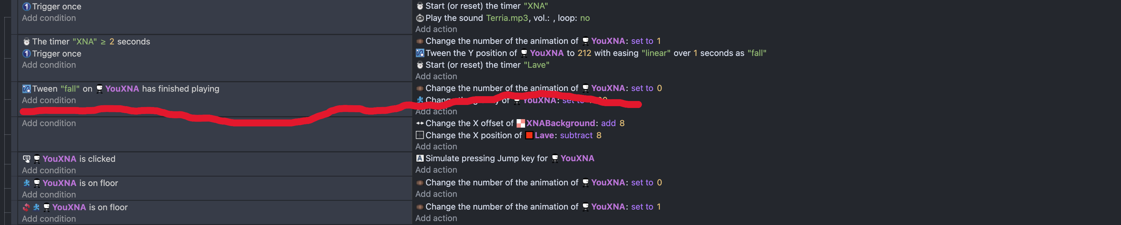 To elaborate on @RMDB’s point, in the event where you check fall tween has finished playing, add the action to delete the tween from the YouXNA object. Otherwise the condition will be true and the animation will constantly set to 0.