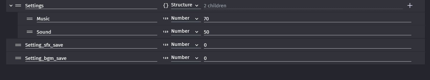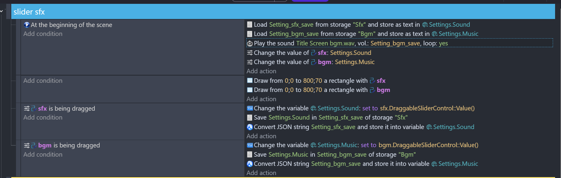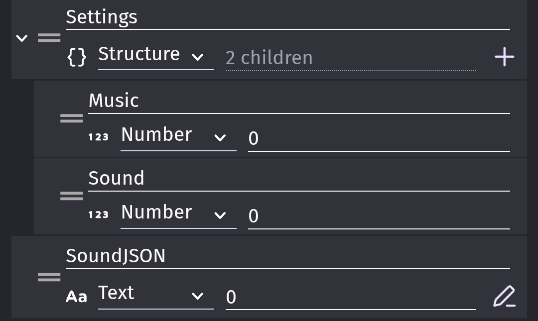 The Setting structure is setup with numeric values but then it’s being loaded as a string. Even if the string contains numbers, if GD is expecting a number variable, it will convert the string to the number zero when you try to set the sliders bc that’s what the action is expecting. A number.