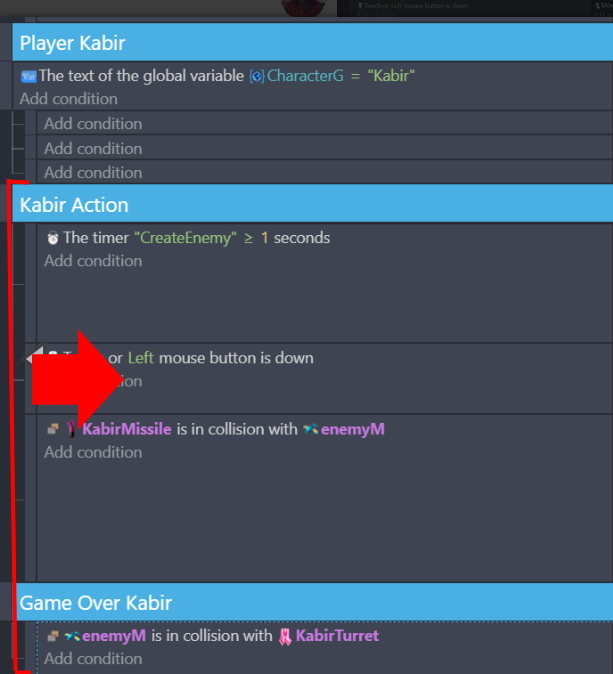 Ah, my bad. On a closer inspection, I see the problem is in one of the screen shots you provided. The “Kabir Action” and “Game Over Kabir” event groups are not subevents of the “Player Kabir” event group. They’re being run no matter which character is being played.