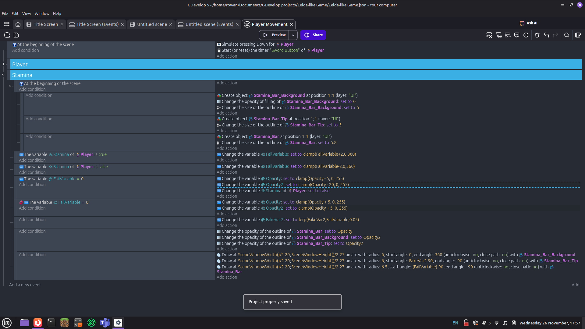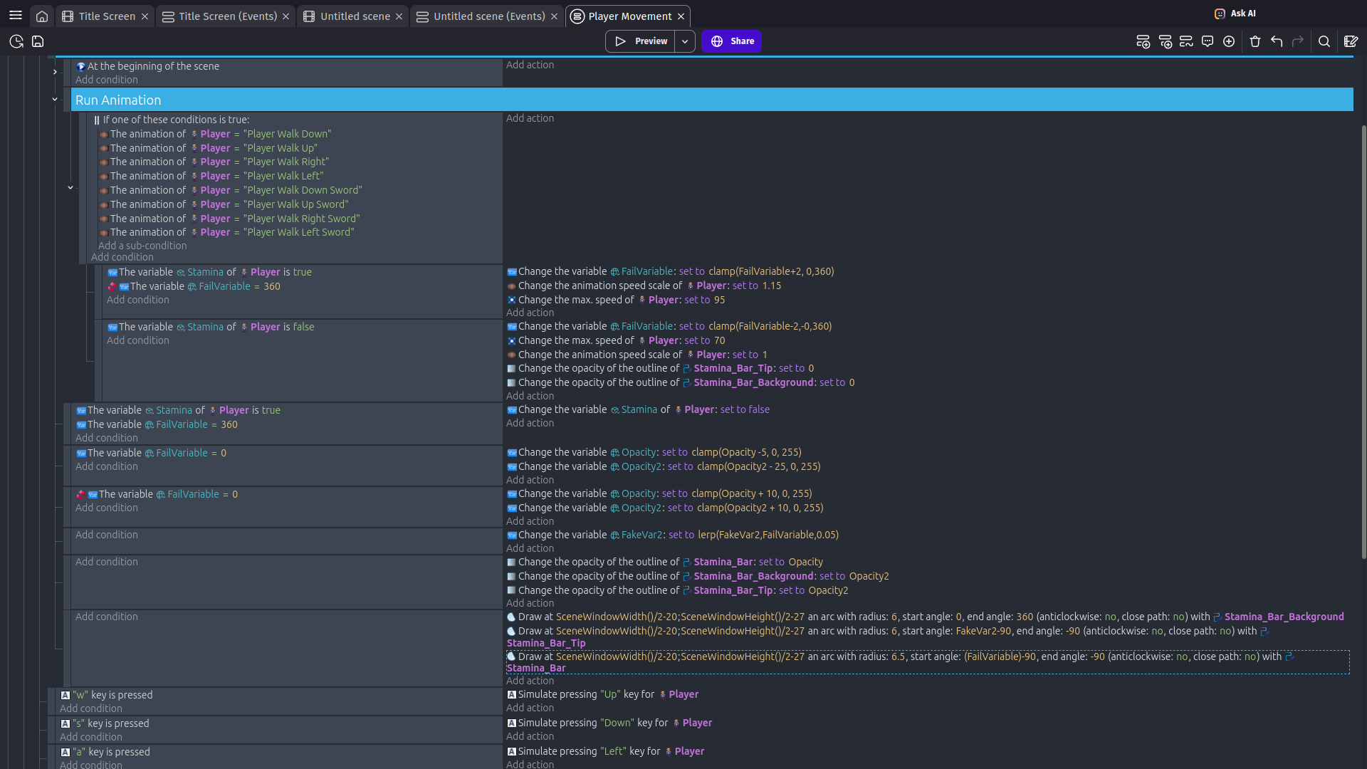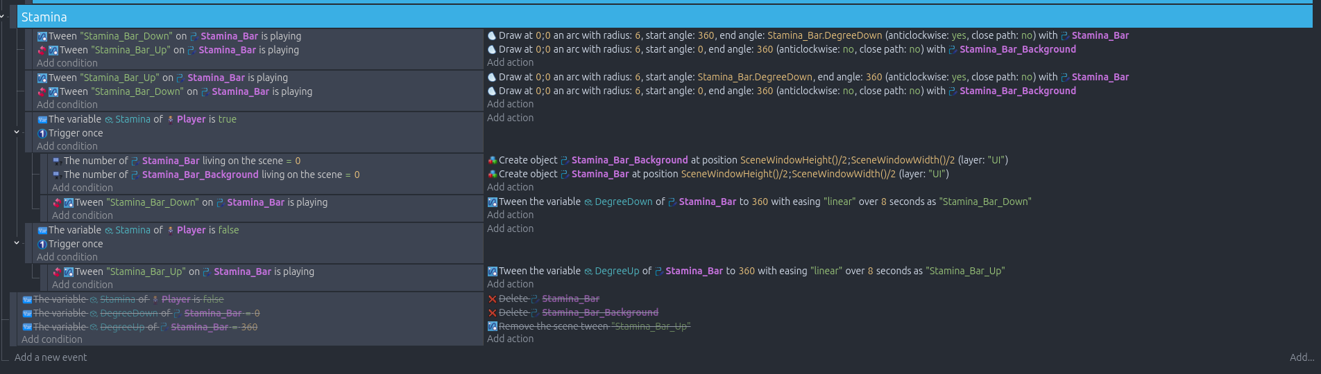 There are just two more questions I’d like to ask. At the end of the stamina refill animation, the red and the background circle seem to disappear a bit slower than the green stamina wheel. Also, I would like the player to stop moving when the stamina has run out. How would I do this?
