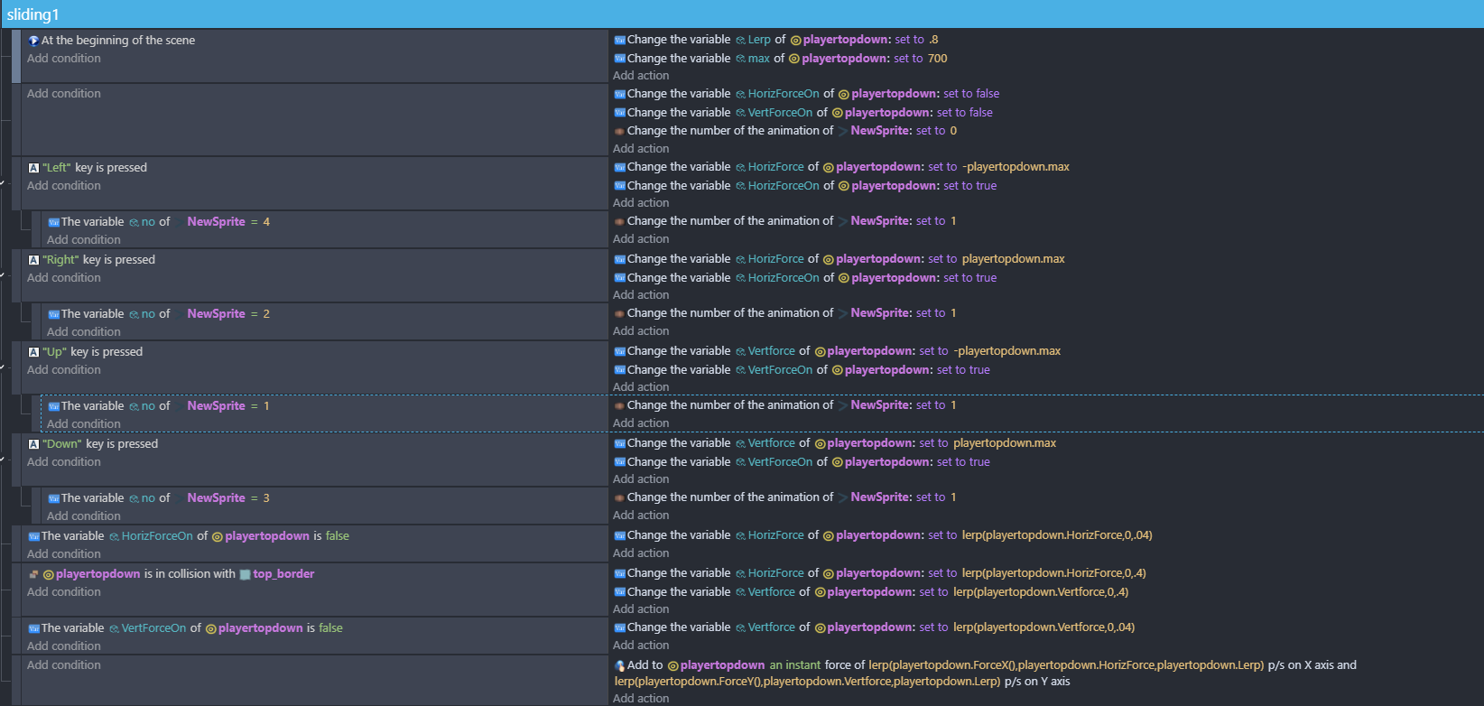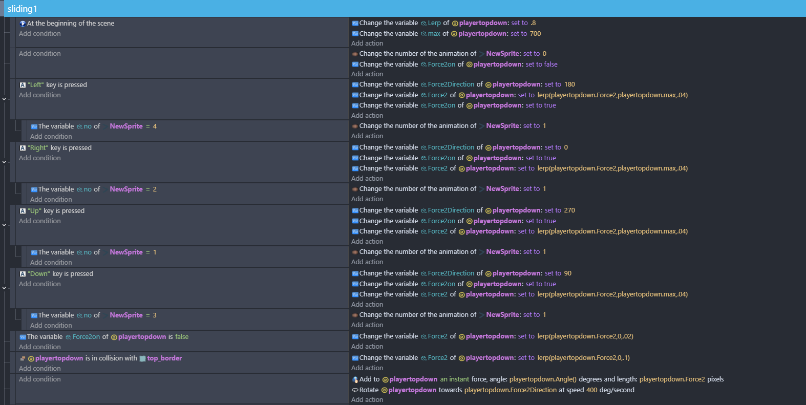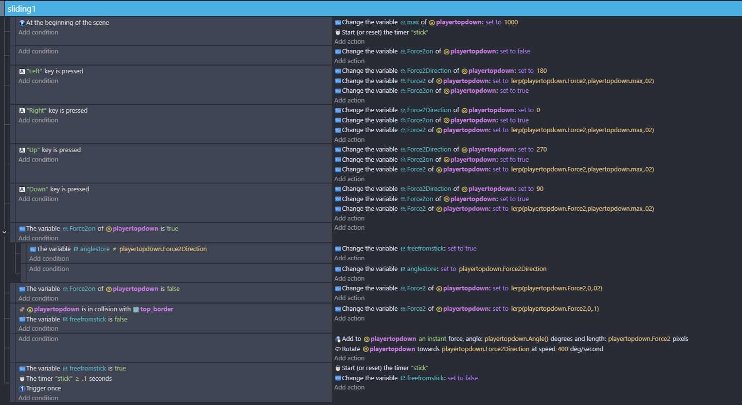 Happy Christmas! I tried some topdown stuff this morning - initially without properly reading through your brief. Then i read through it and im still a bit thrown by 3 but you can achieve this using variable conditions. There’s an obstacle that slows you down and so you could do …when you change direction - check if its a new direction and turn on a boolean var that prevents the collision conditions.