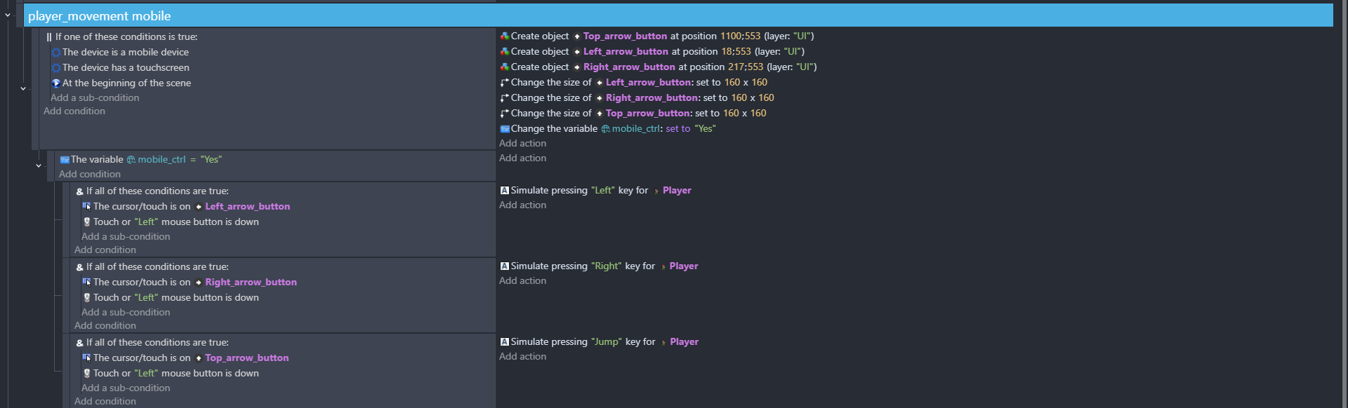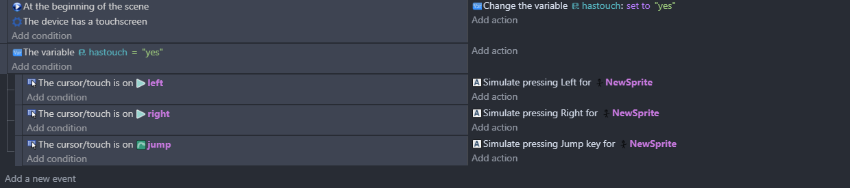 Thank you for your reply, this is my first game on GDevelop and I am still figuring out how to use the program to its fullest. I will try what you recommended, I have it set up that way-excluding the and statements-is for bug testing because I was not on a touch device when coding this.