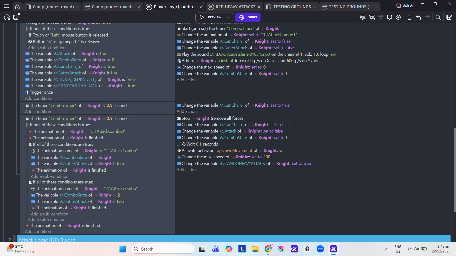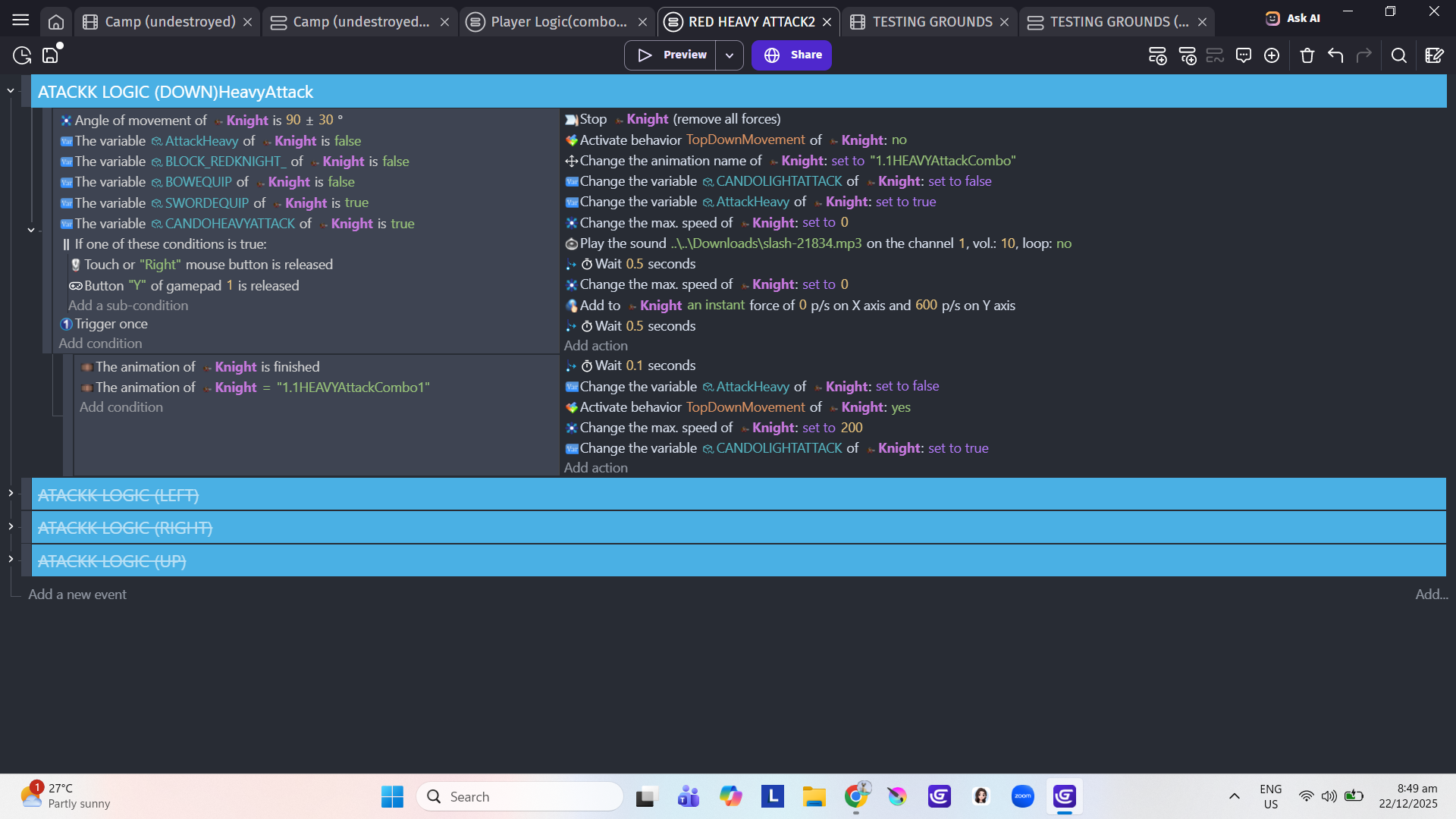 Hi …it’s a little difficult to work out what’s going on but I noticed on the bottom set of events that you’ve got animation conditions in a sub event after a wait …which won’t work as intended. Its better with this sort of the thing to use timers or variables rather than waits.