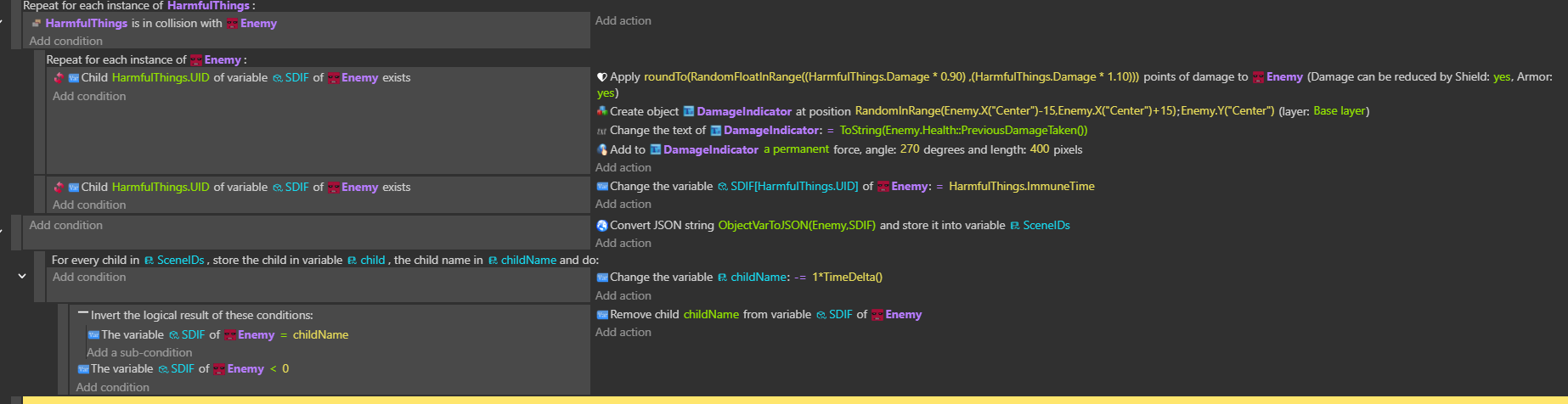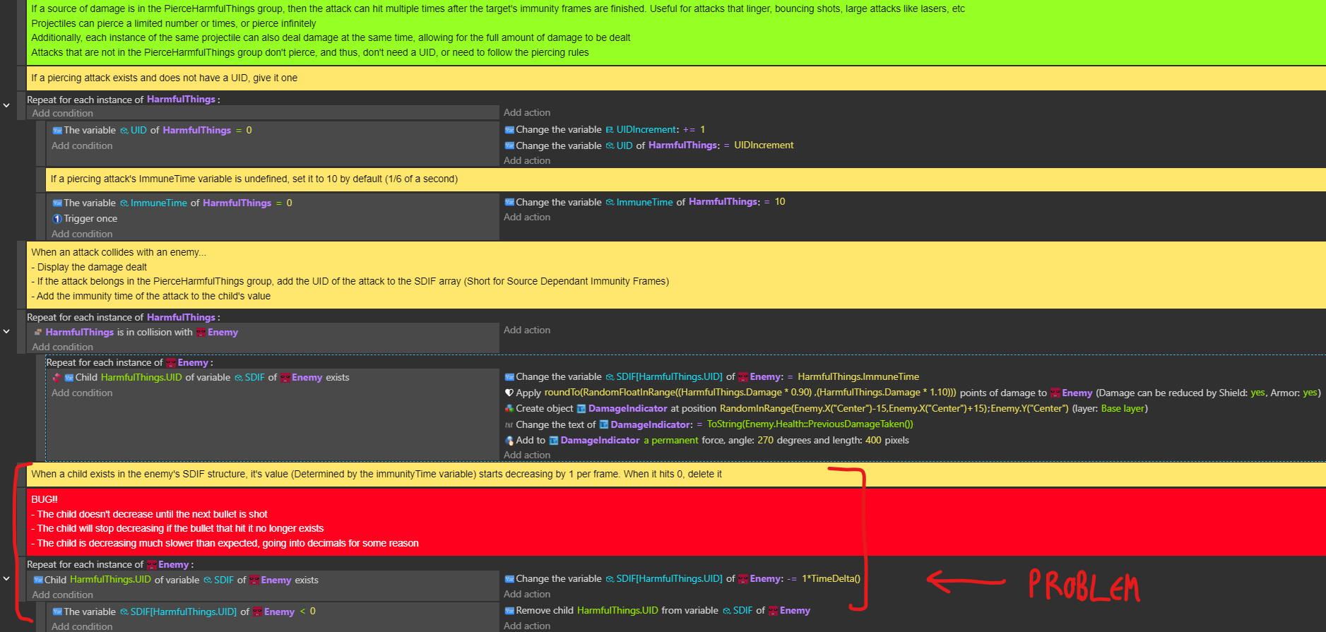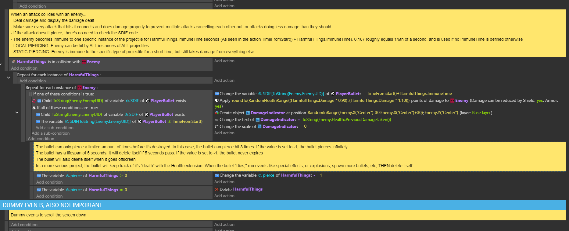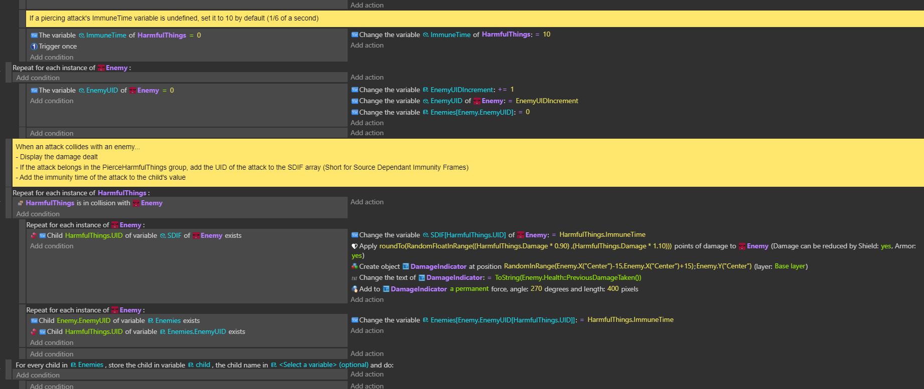 When an enemy is hit by an attack that can pierce, it’s UID is added to a structure variable as a child, with it’s value set to the attack’s immunityTime variable (For immunity frames). Each child variable’s value decreases by 1 per frame, and once it hits 0, delete it from the structure