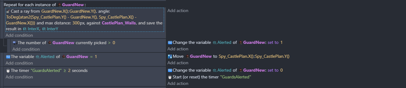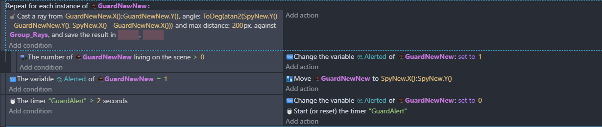 I think the number of picked objects condition should be for the spy. There will always be 1 guard picked because of the for each guard and the fact the ray starts inside of a guard.