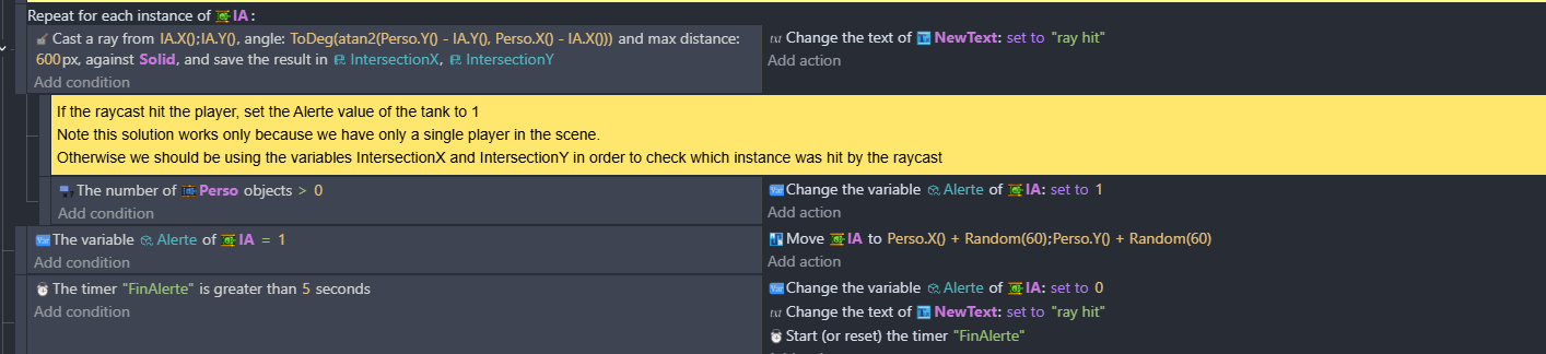 It took me a bit to understand the logic. It uses a group list of walls and a player it then detects the closest object in the set direction and range. If the closest object is a tank then there’s no wall in front of the tank. Nice.