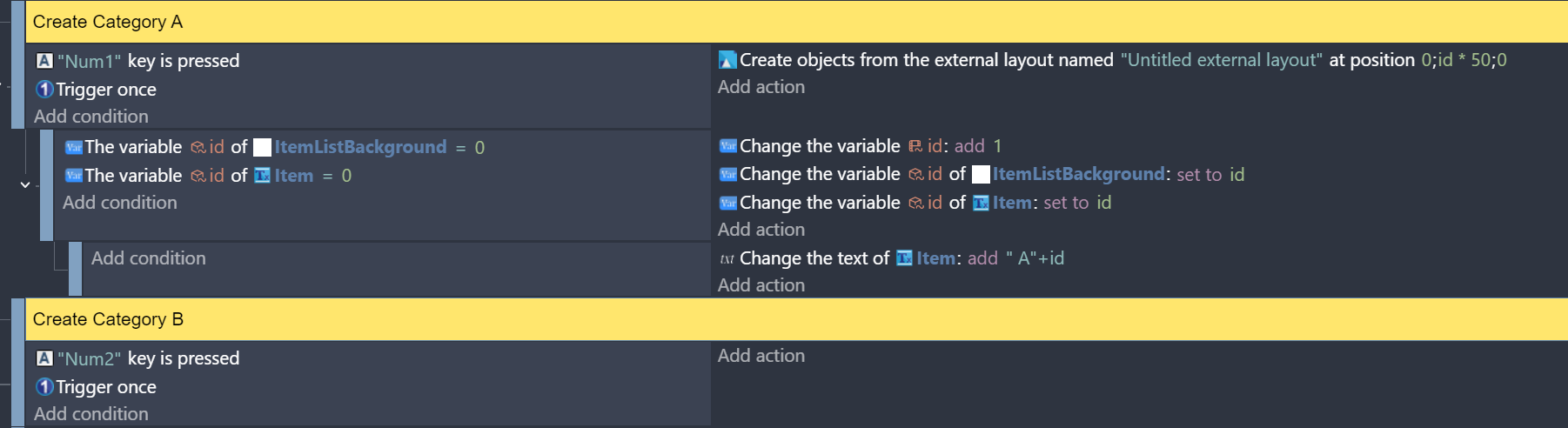 Each item in the list is generated dynamically — right now I’m simulating it by pressing the Num1 key to create a Category A item. It works: when a new item is created, it appears below the previous one.