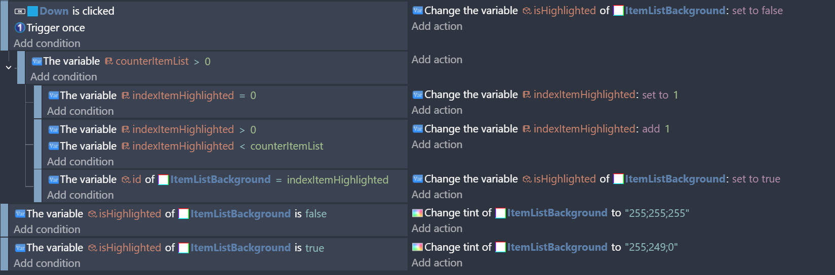 counterItemList is how many items are in the list. indexItemHighlighted is the item that is highlighted. Set the boolean value of the itemListBackground to true if it’s highlighted.
