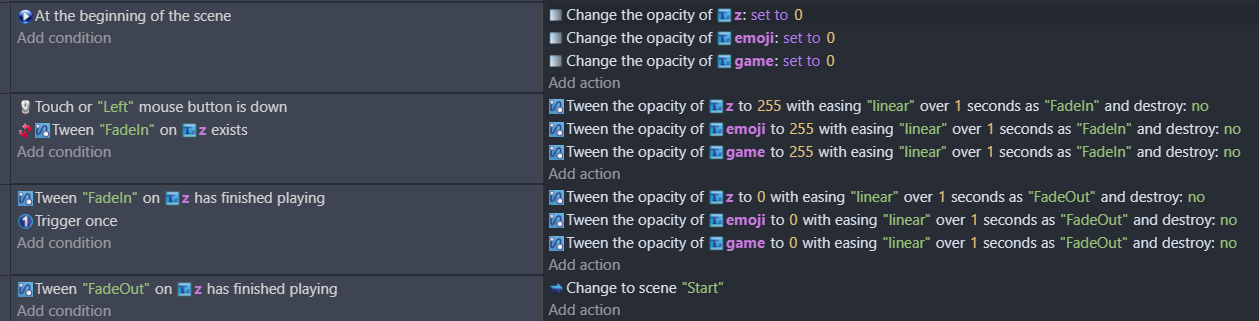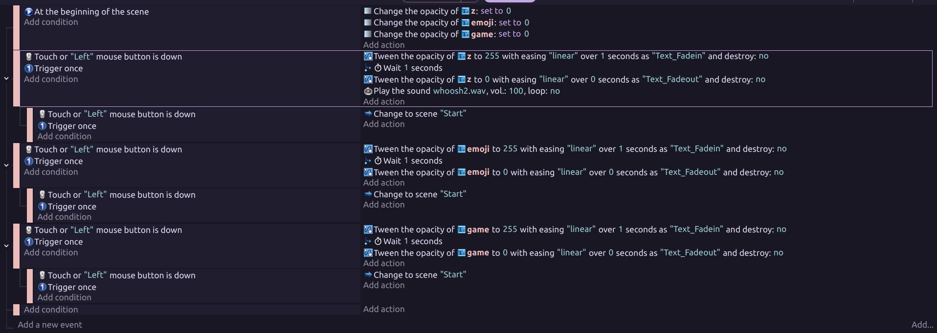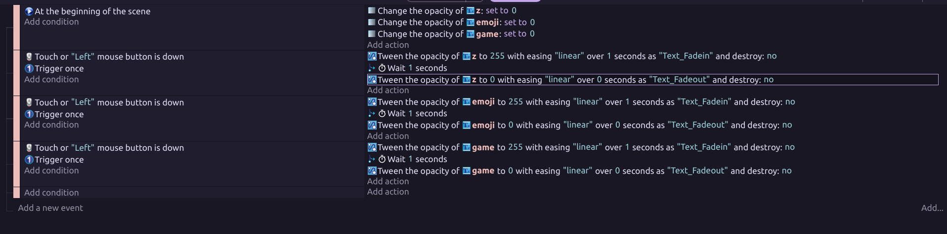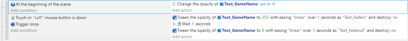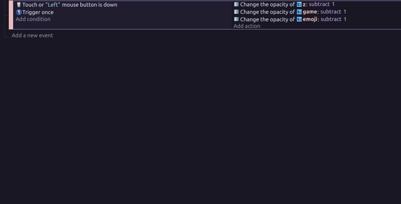 I did (well tried) it but it kinda dont work, so it does change the opacity but⊠by one! so the code it :âConditionsâ : if left mouse button is down,Trigger once,
