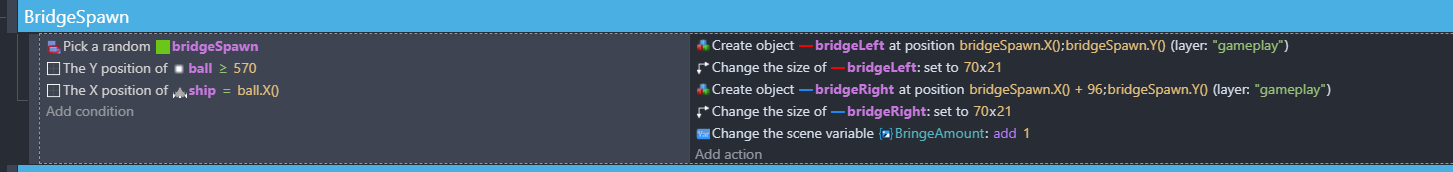 The problem is that a bridge can spawn on top of old bridge. So I have to keep track where bridges have already spawned. When I first made this game in C#, I stored the positions of spawned bridges in an array of “tuples” which allowed me to hold 2 numbers in the same variable: “100, 90” (100 for x and 90 for y). But I don’t think there is anything similar to that in gDevelop.