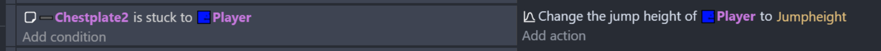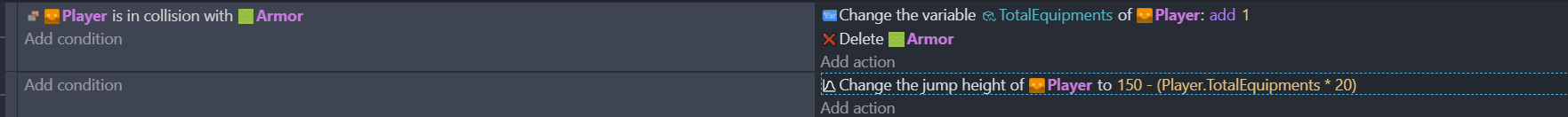 Hello everyone, I’m new here. I just started using Gdevelop and really gave it a good try, but a mechanic I am working on just isn’t working and I would love some help. So the concept is that the player wears three pieces of armor, helmet, platebody and platelegs. His jump when he isn’t wearing it can jump over three blocks, but with every piece of armor the player gets heavier and loses a block of height when jumping. Makes sense? I have really tried and am sure that I have gotten close…hopefully.