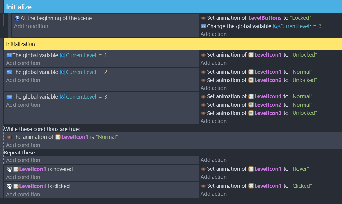 I am developing a level selection screen for my game. It consist of multiple similar buttons and unlocks levels (change states) at the completion of each level using the Global variable “CurrentLevel”.