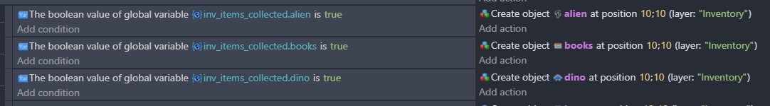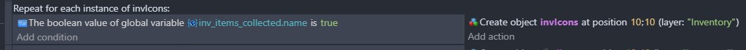 I am sure there is a better way of doing this than checking each item in a separate sub-event. The children of the global variable inv_items_collected have the same name as the inventory item objects, and those objects are in a group, so I think I have set things up for a ‘repeat for each’, but I’m not quite sure how to put it together.