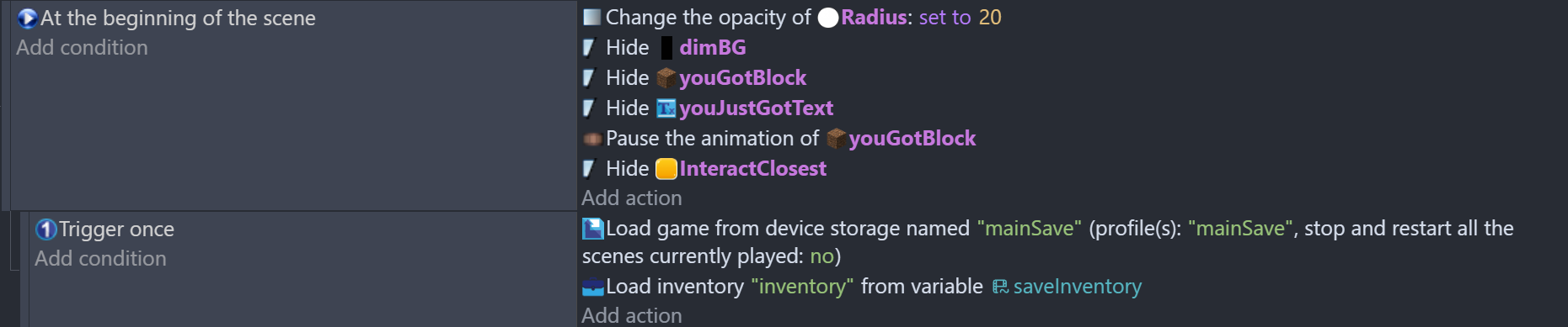 then, at the beginning of the scene, after some initialization stuff unrelated to my issue, the save should be loaded, including that variable, and then the inventory should be loaded from that variable.