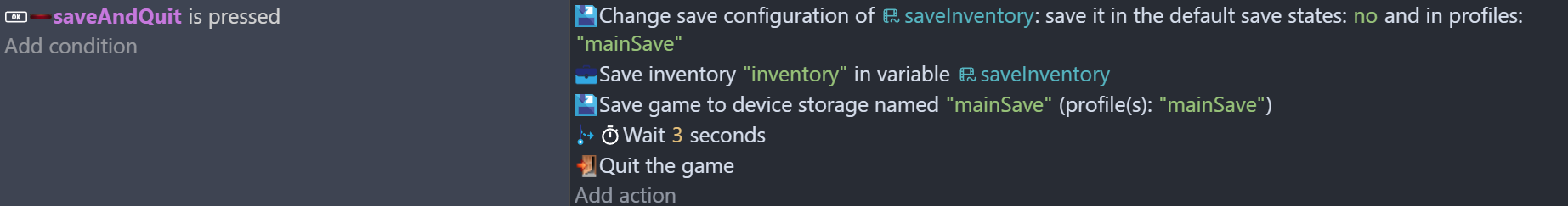 when i press the save and quit button, the saveInventory variable should have its configuration changed so that it is included in “mainSave” profile. then the inventory “inventory” should be saved to that variable, then a save state should be made with the key “mainSave” under the “mainSave” profile, which should include that variable. Then after 3 seconds the game quits, as it’s supposed to.